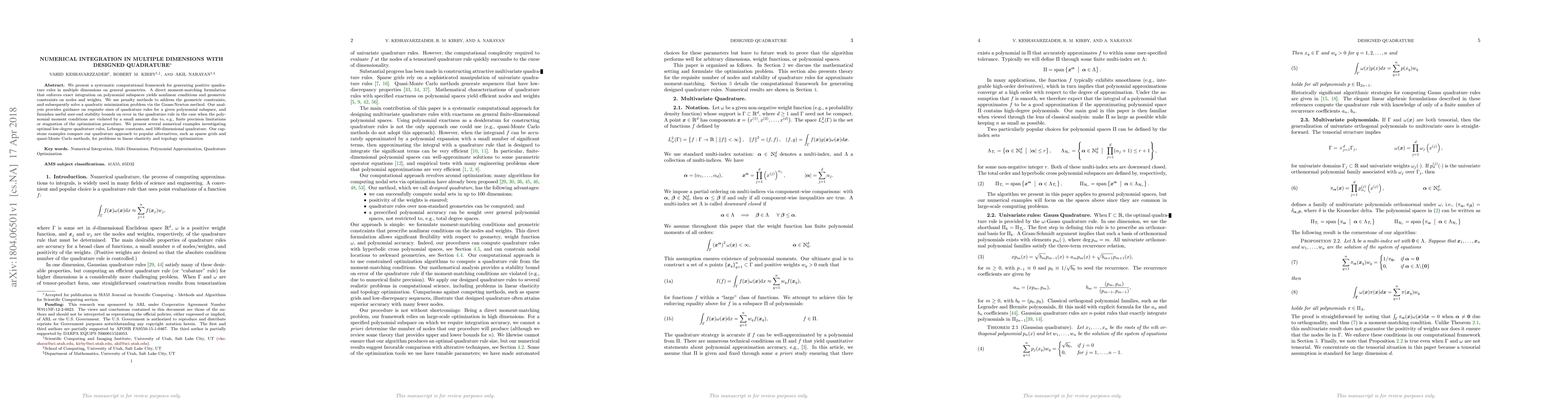 This paper develops a computational framework for generating positive quadrature rules in multiple dimensions, focusing on moment-matching to enforce exact integration on polynomial subspaces. It employs penalty methods and the Gauss-Newton method for optimization, providing stability bounds and comparing its approach to sparse grids and quasi-Monte Carlo methods in applications like linear elasticity and topology optimization.