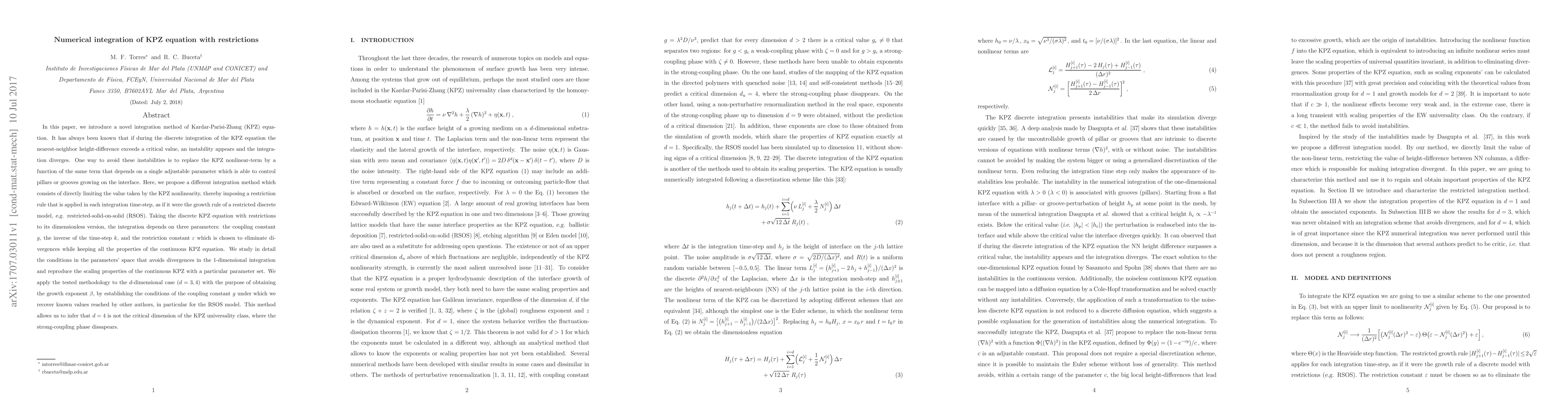 In this paper, we introduce a novel integration method of Kardar-Parisi-Zhang (KPZ) equation. It has always been known that if during the discrete integration of the KPZ equation the nearest-neighbor height-difference exceeds a critical value, an instability appears and the integration diverges. One way to avoid these instabilities is to replace the KPZ nonlinear-term by a function of the same term that depends on a single adjustable parameter which is able to control pillars or grooves growing on the interface. Here, we propose a different integration method which consists of directly limiting the value taken by the KPZ nonlinearity, thereby imposing a restriction rule that is applied in each integration time-step, as if it were the growth rule of a restricted discrete model, e.g. restricted-solid-on-solid (RSOS). Taking the discrete KPZ equation with restrictions to its dimensionless version, the integration depends on three parameters: the coupling constant $g$, the inverse of the time-step $k$, and the restriction constant $\varepsilon$ which is chosen to eliminate divergences while keeping all the properties of the continuous KPZ equation. We study in detail the conditions in the parameters' space that avoids divergences in the 1-dimensional integration and reproduce the scaling properties of the continuous KPZ with a particular parameter set. We apply the tested methodology to the $d$-dimensional case ($d = 3,4$) with the purpose of obtaining the growth exponent $\beta$, by establishing the conditions of the coupling constant $g$ under which we recover known values reached by other authors, in particular for the RSOS model. This method allows us to infer that $d = 4$ is not the critical dimension of the KPZ universality class, where the strong-coupling phase dissapears.