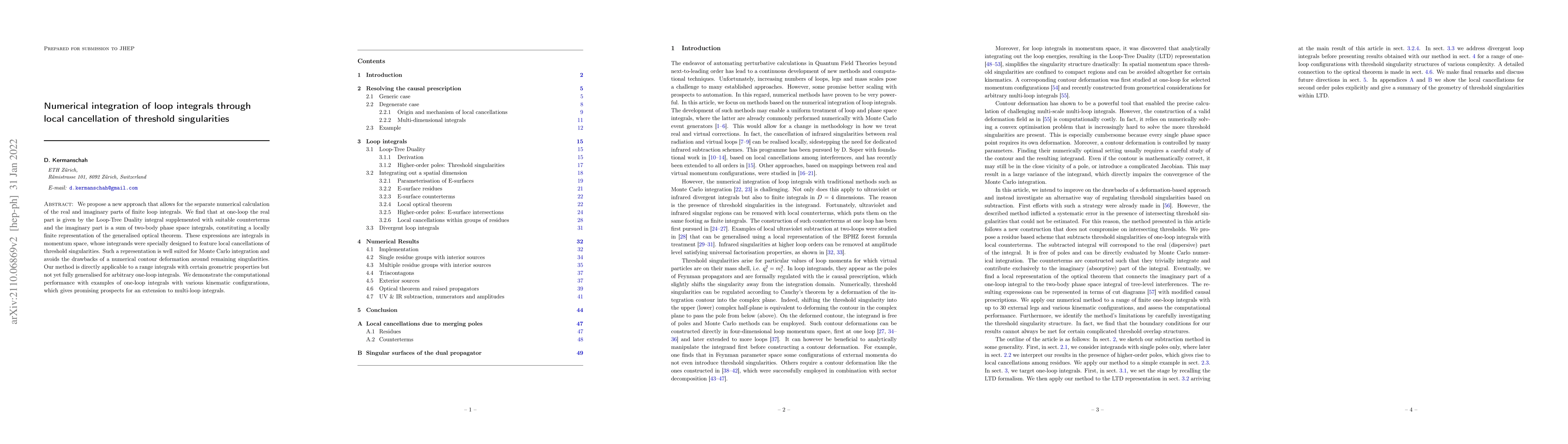 This paper introduces a novel method for numerically integrating one-loop loop integrals by separating real and imaginary parts, leveraging local cancellation of threshold singularities. The real part uses Loop-Tree Duality integrals with counterterms, while the imaginary part is derived from two-body phase space integrals, facilitating efficient Monte Carlo integration.