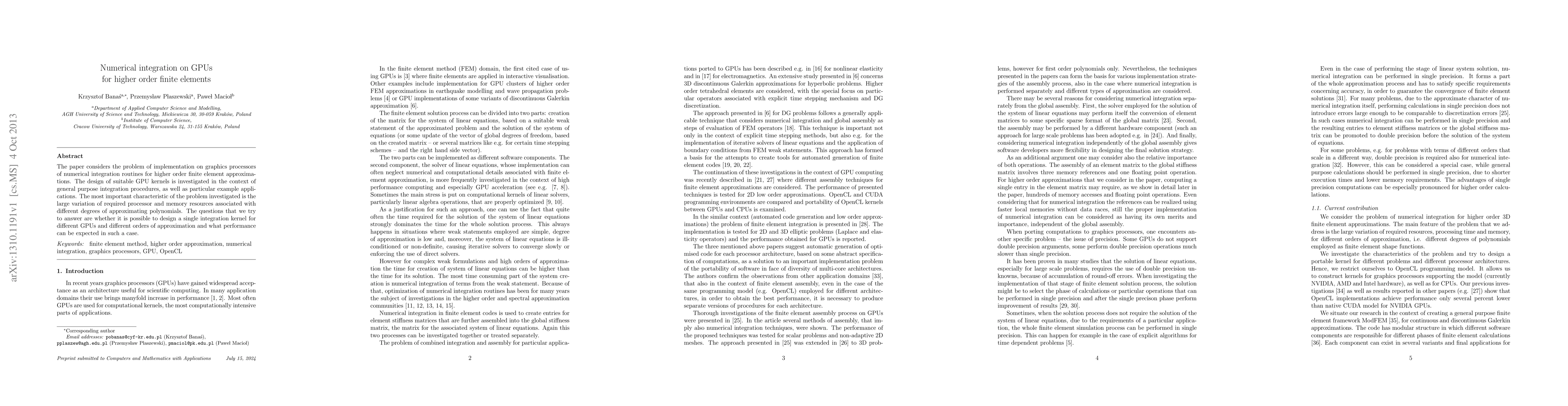 The paper considers the problem of implementation on graphics processors of numerical integration routines for higher order finite element approximations. The design of suitable GPU kernels is investigated in the context of general purpose integration procedures, as well as particular example applications. The most important characteristic of the problem investigated is the large variation of required processor and memory resources associated with different degrees of approximating polynomials. The questions that we try to answer are whether it is possible to design a single integration kernel for different GPUs and different orders of approximation and what performance can be expected in such a case.