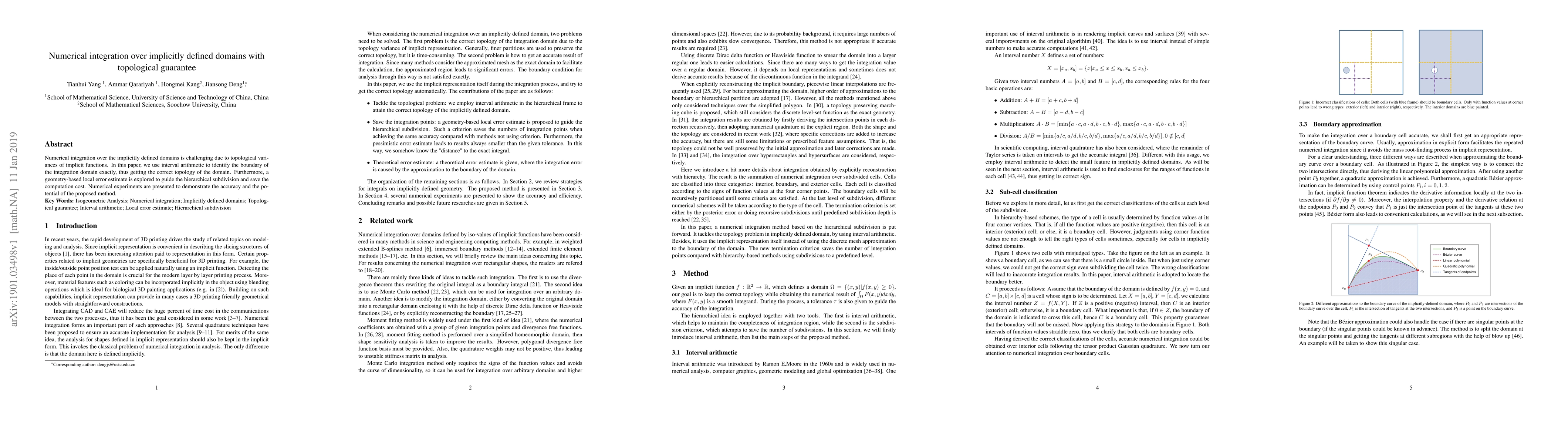 This paper proposes a method using interval arithmetic to accurately determine the boundary of implicitly defined integration domains, ensuring correct topology. It also introduces a geometry-based local error estimate to optimize hierarchical subdivision, balancing accuracy and computational cost, as demonstrated by numerical experiments.