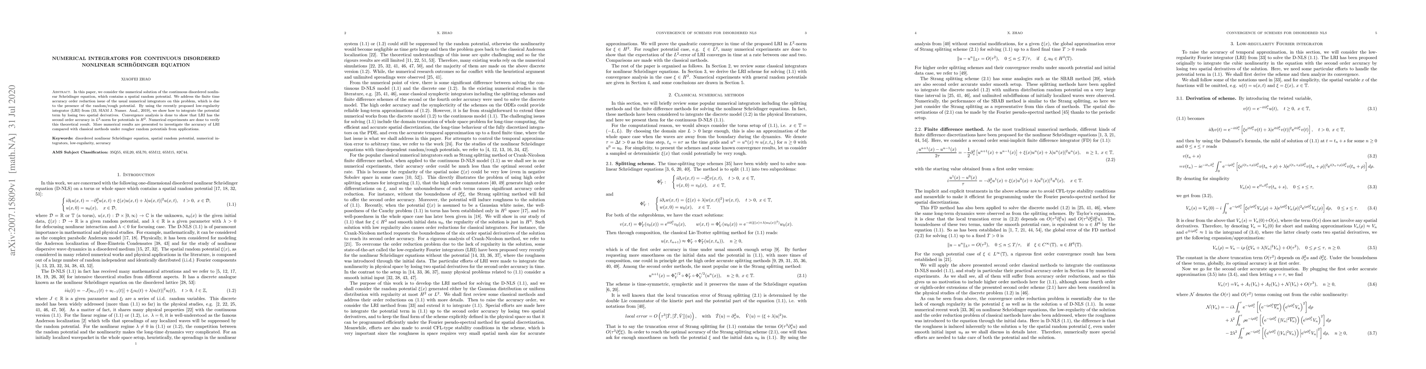 In this paper, we consider the numerical solution of the continuous disordered nonlinear Schr\"odinger equation, which contains a spatial random potential. We address the finite time accuracy order reduction issue of the usual numerical integrators on this problem, which is due to the presence of the random/rough potential. By using the recently proposed low-regularity integrator (LRI) from (33, SIAM J. Numer. Anal., 2019), we show how to integrate the potential term by losing two spatial derivatives. Convergence analysis is done to show that LRI has the second order accuracy in $L^2$-norm for potentials in $H^2$. Numerical experiments are done to verify this theoretical result. More numerical results are presented to investigate the accuracy of LRI compared with classical methods under rougher random potentials from applications.