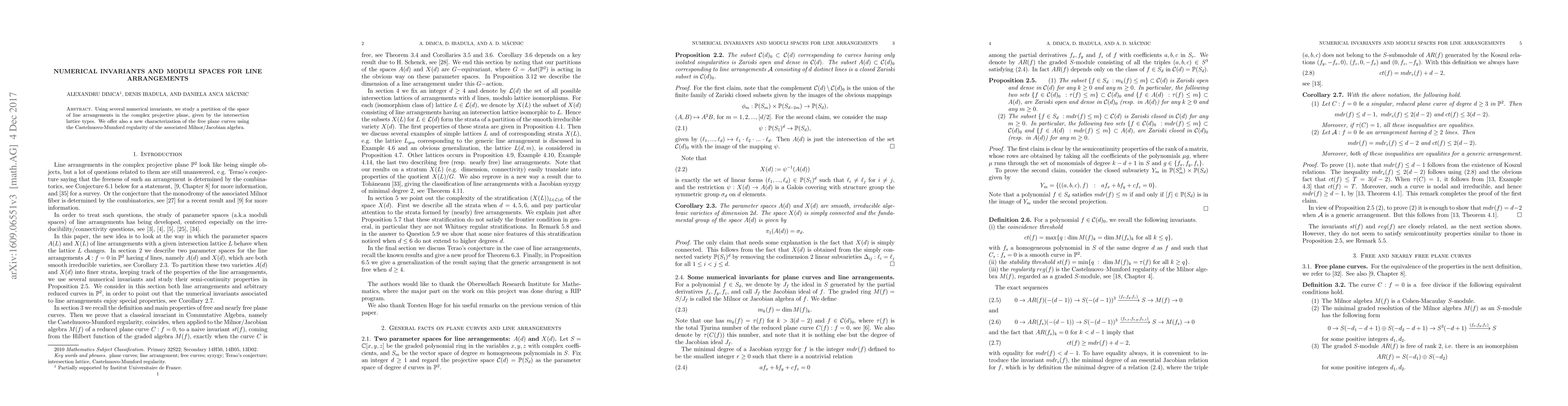 Using several numerical invariants, we study a partition of the space of line arrangements in the complex projective plane, given by the intersection lattice types. We offer also a new characterization of the free plane curves using the Castelnuovo-Mumford regularity of the associated Milnor/Jacobian algebra.