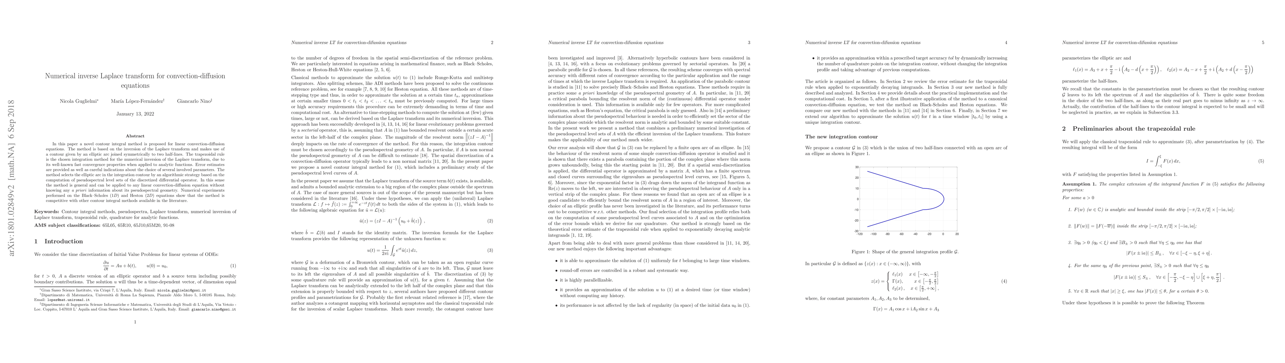 This paper introduces a novel contour integral method for numerically inverting the Laplace transform to solve linear convection-diffusion equations, employing an elliptic arc contour and the trapezoidal rule for fast convergence. The method is shown to be competitive through numerical experiments on the Black-Scholes and Heston equations.