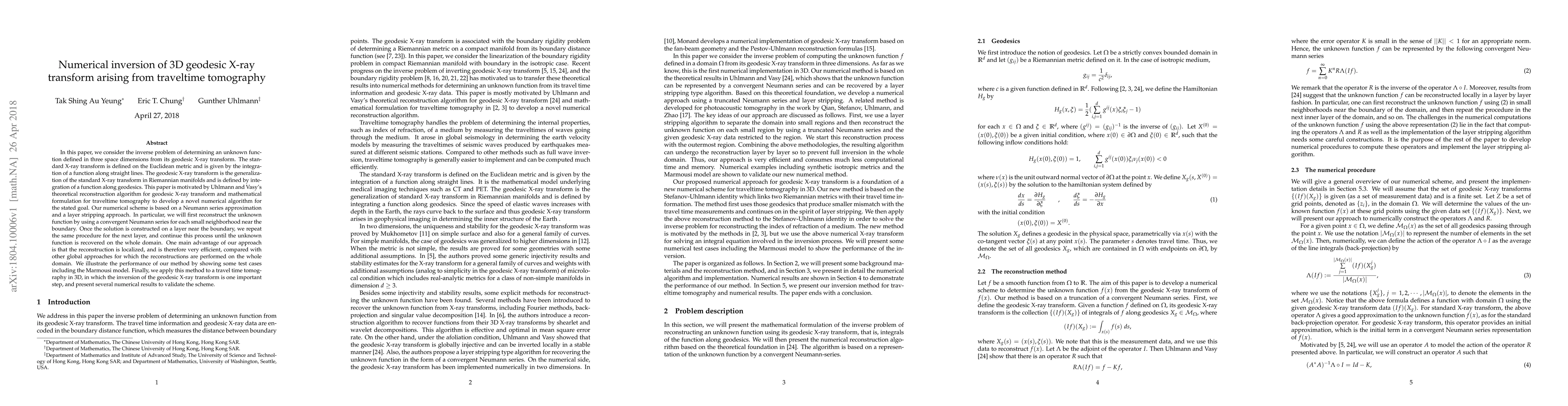 In this paper, we consider the inverse problem of determining an unknown function defined in three space dimensions from its geodesic X-ray transform. The standard X-ray transform is defined on the Euclidean metric and is given by the integration of a function along straight lines. The geodesic X-ray transform is the generalization of the standard X-ray transform in Riemannian manifolds and is defined by integration of a function along geodesics. This paper is motivated by Uhlmann and Vasy's theoretical reconstruction algorithm for geodesic X-ray transform and mathematical formulation for traveltime tomography to develop a novel numerical algorithm for the stated goal. Our numerical scheme is based on a Neumann series approximation and a layer stripping approach. In particular, we will first reconstruct the unknown function by using a convergent Neumann series for each small neighborhood near the boundary. Once the solution is constructed on a layer near the boundary, we repeat the same procedure for the next layer, and continue this process until the unknown function is recovered on the whole domain. One main advantage of our approach is that the reconstruction is localized, and is therefore very efficient, compared with other global approaches for which the reconstructions are performed on the whole domain. We illustrate the performance of our method by showing some test cases including the Marmousi model. Finally, we apply this method to a travel time tomography in 3D, in which the inversion of the geodesic X-ray transform is one important step, and present several numerical results to validate the scheme.
