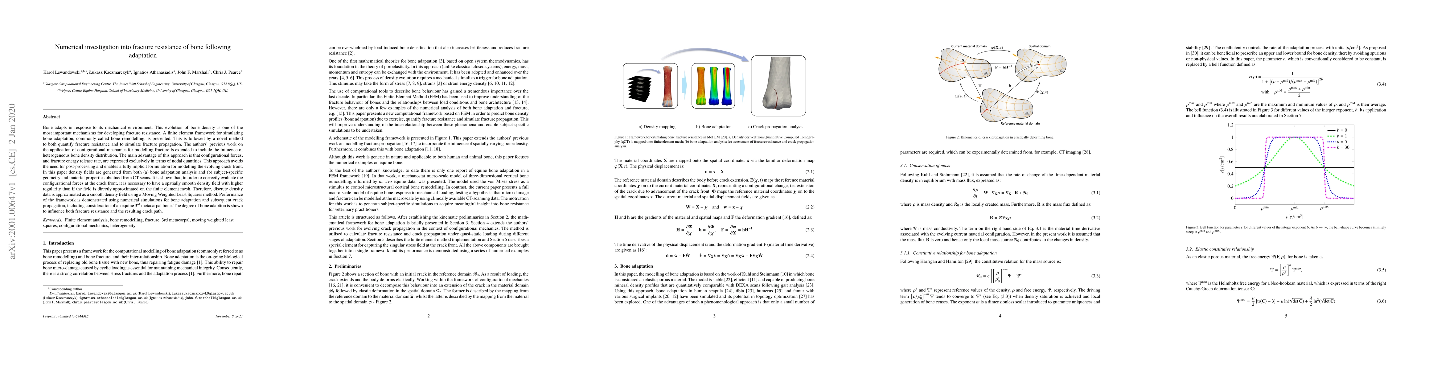 Bone adapts in response to its mechanical environment. This evolution of bone density is one of the most important mechanisms for developing fracture resistance. A finite element framework for simulating bone adaptation, commonly called bone remodelling, is presented. This is followed by a novel method to both quantify fracture resistance and to simulate fracture propagation. The authors' previous work on the application of configurational mechanics for modelling fracture is extended to include the influence of heterogeneous bone density distribution. The main advantage of this approach is that configurational forces, and fracture energy release rate, are expressed exclusively in terms of nodal quantities. This approach avoids the need for post-processing and enables a fully implicit formulation for modelling the evolving crack front. In this paper density fields are generated from both (a) bone adaptation analysis and (b) subject-specific geometry and material properties obtained from CT scans. It is shown that, in order to correctly evaluate the configurational forces at the crack front, it is necessary to have a spatially smooth density field with higher regularity than if the field is directly approximated on the finite element mesh. Therefore, discrete density data is approximated as a smooth density field using a Moving Weighted Least Squares method. Performance of the framework is demonstrated using numerical simulations for bone adaptation and subsequent crack propagation, including consideration of an equine 3rd metacarpal bone. The degree of bone adaption is shown to influence both fracture resistance and the resulting crack path.