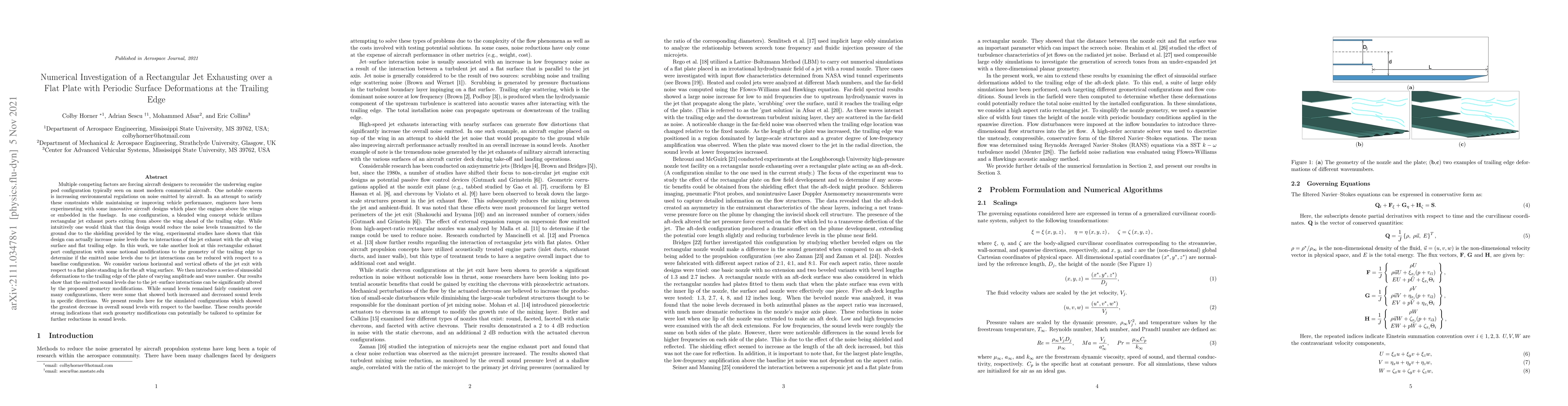 Researchers investigated reducing jet noise by modifying a rectangular exhaust port configuration over a flat plate with periodic surface deformations at the trailing edge, showing potential for optimized sound level reductions.