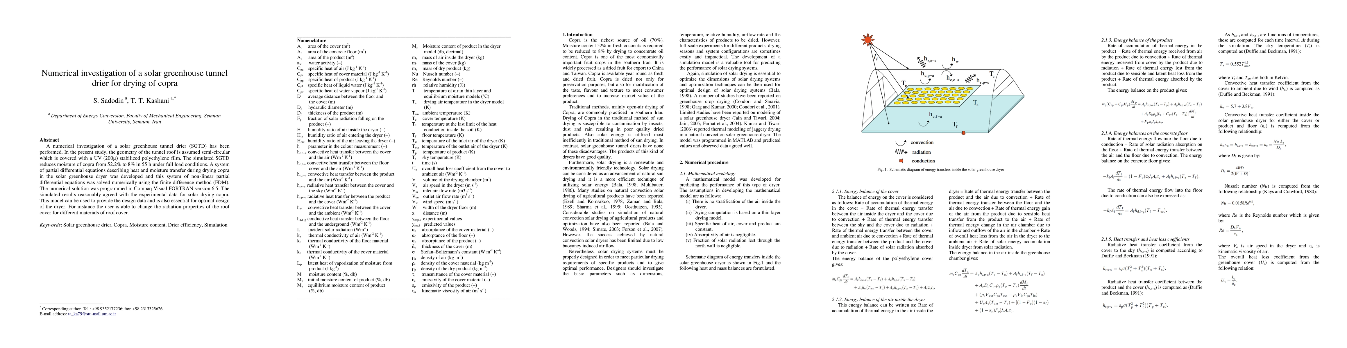 A numerical investigation of a solar greenhouse tunnel drier (SGTD) has been performed. In the present study, the geometry of the tunnel roof is assumed semi-circular which is covered with a UV (200\mu) stabilized polyethylene film. The simulated SGTD reduces moisture of copra from 52.2% to 8% in 55 h under full load conditions. A system of partial differential equations describing heat and moisture transfer during drying copra in the solar greenhouse dryer was developed and this system of non-linear partial differential equations was solved numerically using the finite difference method (FDM). The numerical solution was programmed in Compaq Visual FORTRAN version 6.5. The simulated results reasonably agreed with the experimental data for solar drying copra. This model can be used to provide the design data and is also essential for optimal design of the dryer. For instance the user is able to change the radiation properties of the roof cover for different materials of roof cover.