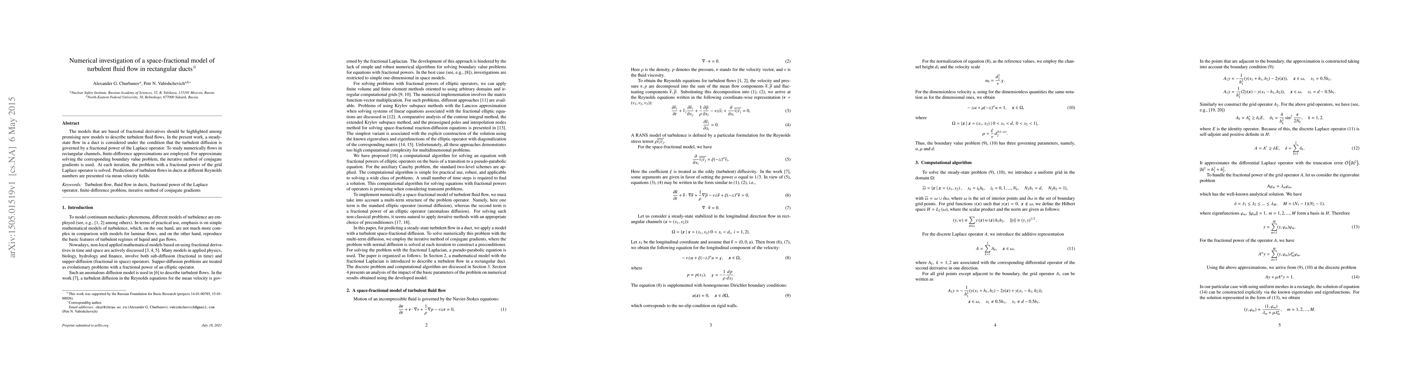 The models that are based of fractional derivatives should be highlighted among promising new models to describe turbulent fluid flows. In the present work, a steady-state flow in a duct is considered under the condition that the turbulent diffusion is governed by a fractional power of the Laplace operator. To study numerically flows in rectangular channels, finite-difference approximations are employed. For approximate solving the corresponding boundary value problem, the iterative method of conjugate gradients is used. At each iteration, the problem with a fractional power of the grid Laplace operator is solved. Predictions of turbulent flows in ducts at different Reynolds numbers are presented via mean velocity fields.