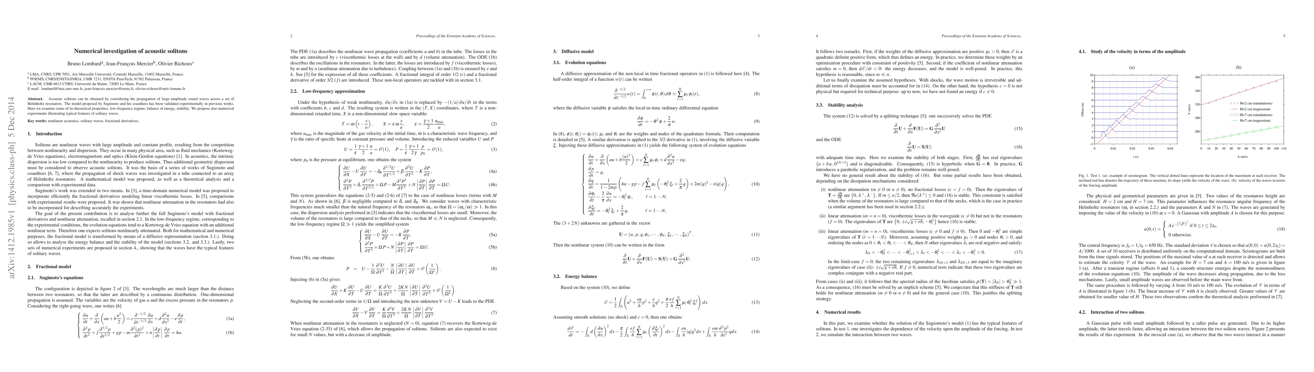 This paper investigates the theoretical properties of acoustic solitons, focusing on low-frequency regimes, energy balance, and stability, using the Sugimoto model. Numerical experiments demonstrate the typical characteristics of solitary waves in this context.