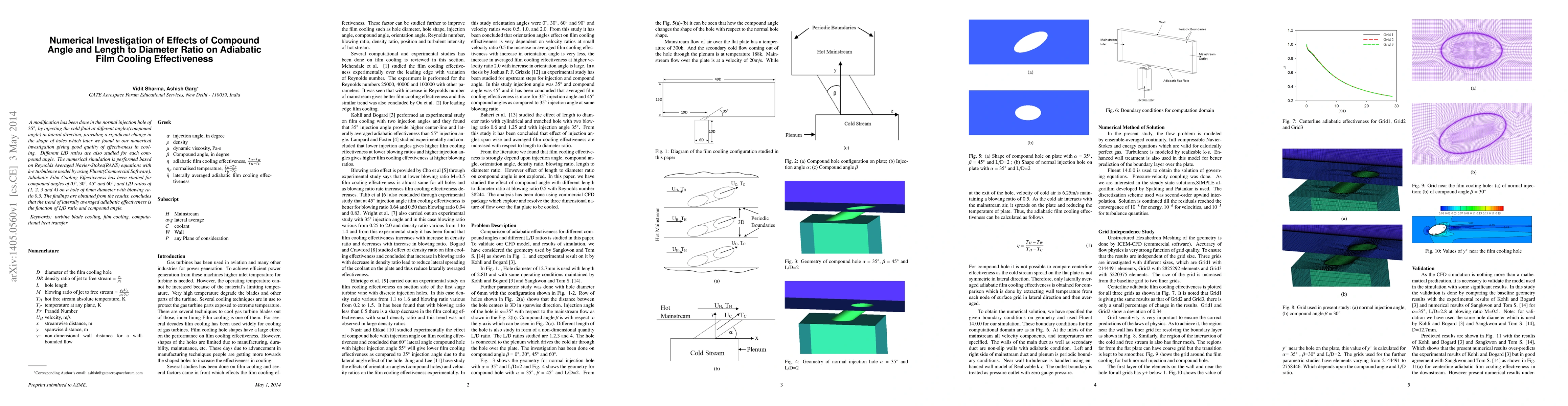 A modification has been done in the normal injection hole of 35 degree, by injecting the cold fluid at different angles(compound angle) in lateral direction, providing a significant change in the shape of holes which later we found in our numerical investigation giving good quality of effectiveness in cooling. Different L/D ratios are also studied for each compound angle. The numerical simulation is performed based on Reynolds Averaged Navier-Stokes(RANS) equations with k-epsilon turbulence model by using Fluent(Commercial Software). Adiabatic Film Cooling Effectiveness has been studied for compound angles of (0, 30, 45 and 60 degrees) and L/D ratios of (1, 2, 3 and 4) on a hole of 6mm diameter with blowing ratio 0.5. The findings are obtained from the results, concludes that the trend of laterally averaged adiabatic effectiveness is the function of L/D ratio and compound angle.