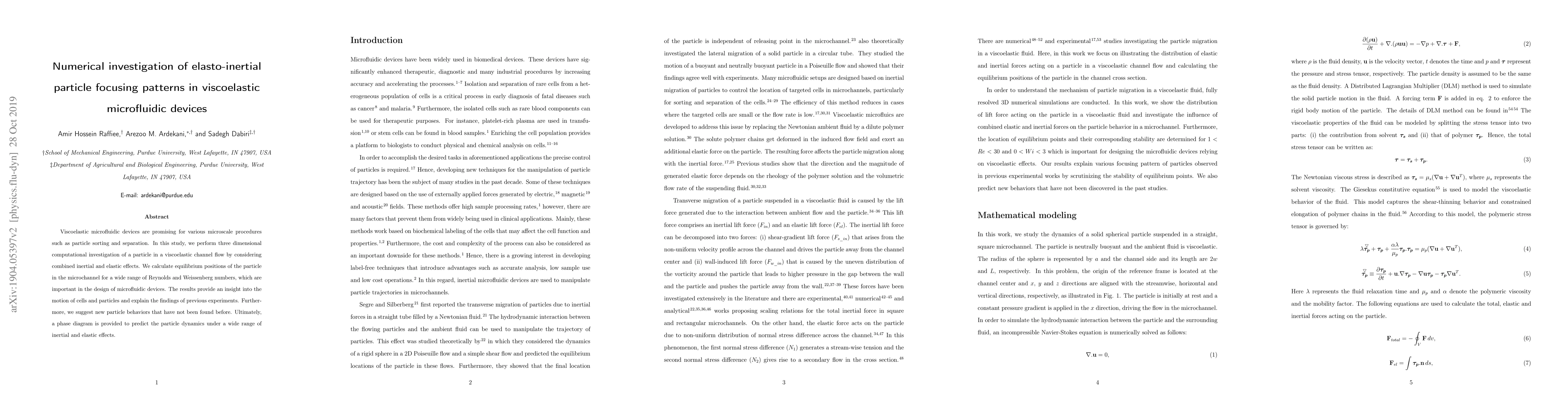 This paper investigates the focusing patterns of particles in viscoelastic microfluidic channels using 3D computational modeling, considering both inertial and elastic forces. The results offer insights into particle behavior and suggest new dynamics, culminating in a phase diagram for predicting particle dynamics across various conditions.