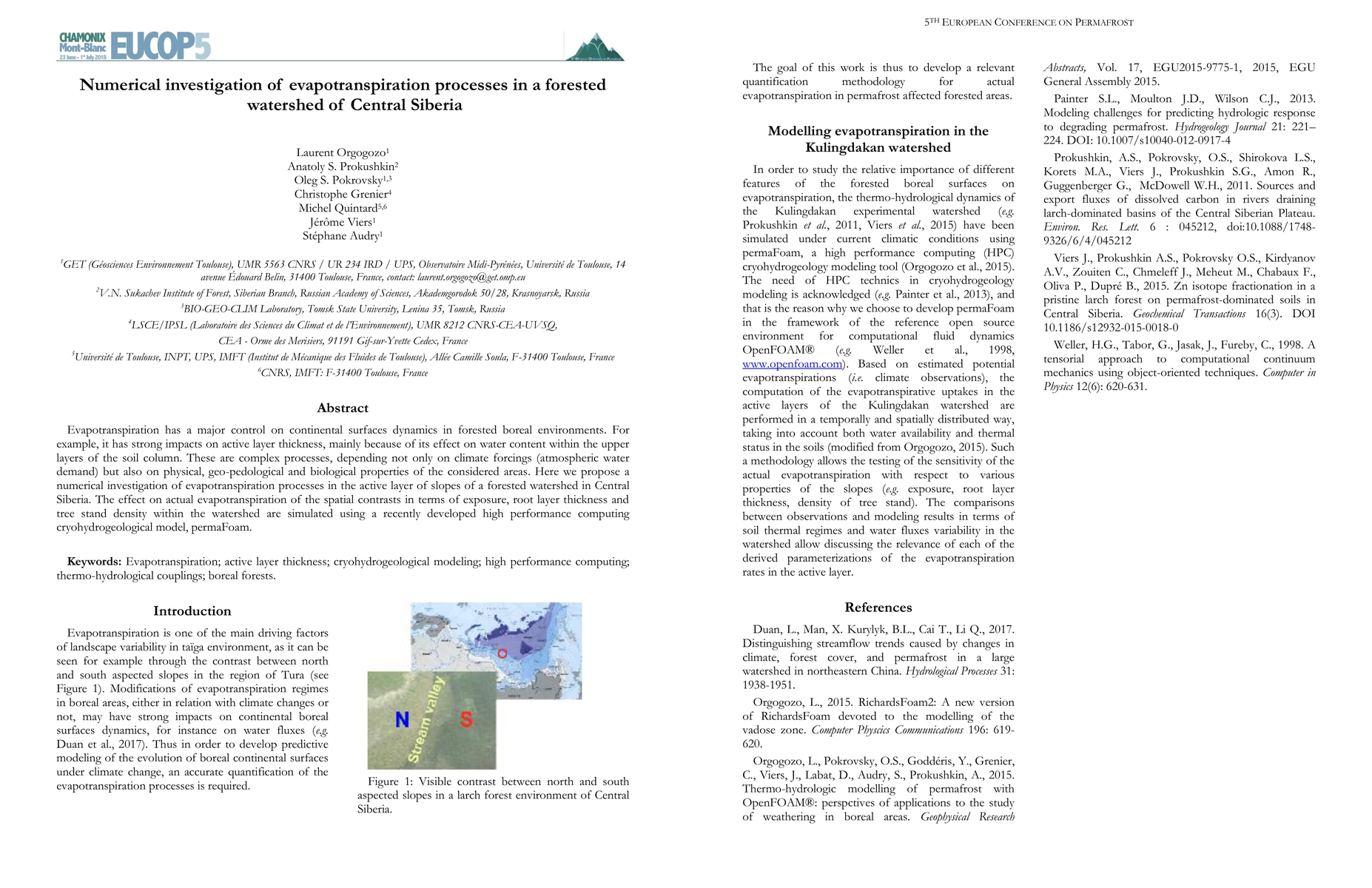 Evapotranspiration has a major control on continental surfaces dynamics in forested boreal environments. For example, it has strong impacts on active layer thickness, mainly because of its effect on water content within the upper layers of the soil column. These are complex processes, depending not only on climate forcings (atmospheric water demand) but also on physical, geo-pedological and biological properties of the considered areas. Here we propose a numerical investigation of evapotranspiration processes in the active layer of slopes of a forested watershed in Central Siberia. The effect on actual evapotranspiration of the spatial contrasts in terms of exposure, root layer thickness and tree stand density within the watershed are simulated using a recently developed high performance computing cryohydrogeological model, permaFoam.