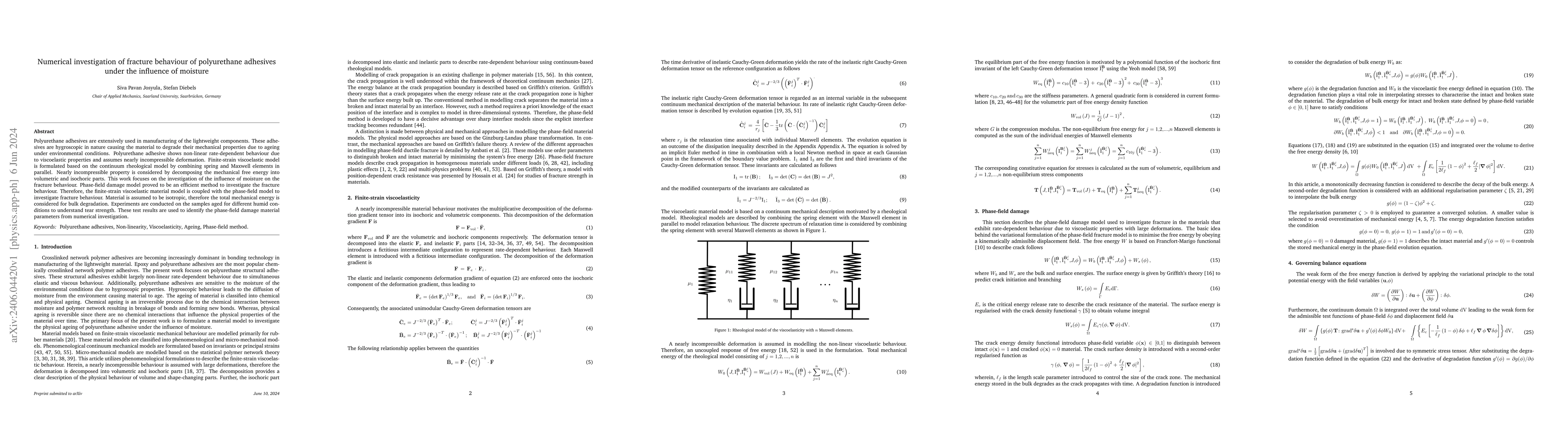 Polyurethane adhesives are extensively used in manufacturing of the lightweight components. These adhesives are hygroscopic in nature causing the material to degrade their mechanical properties due to ageing under environmental conditions. Polyurethane adhesive shows non-linear rate-dependent behaviour due to viscoelastic properties and assumes nearly incompressible deformation. Finite-strain viscoelastic model is formulated based on the continuum rheological model by combining spring and Maxwell elements in parallel. Nearly incompressible property is considered by decomposing the mechanical free energy into volumetric and isochoric parts. This work focuses on the investigation of the influence of moisture on the fracture behaviour. Phase-field damage model proved to be an efficient method to investigate the fracture behaviour. Therefore, the finite-strain viscoelastic material model is coupled with the phase-field model to investigate fracture behaviour. Material is assumed to be isotropic, therefore the total mechanical energy is considered for bulk degradation. Experiments are conducted on the samples aged for different humid conditions to understand tear strength. These test results are used to identify the phase-field damage material parameters from numerical investigation.