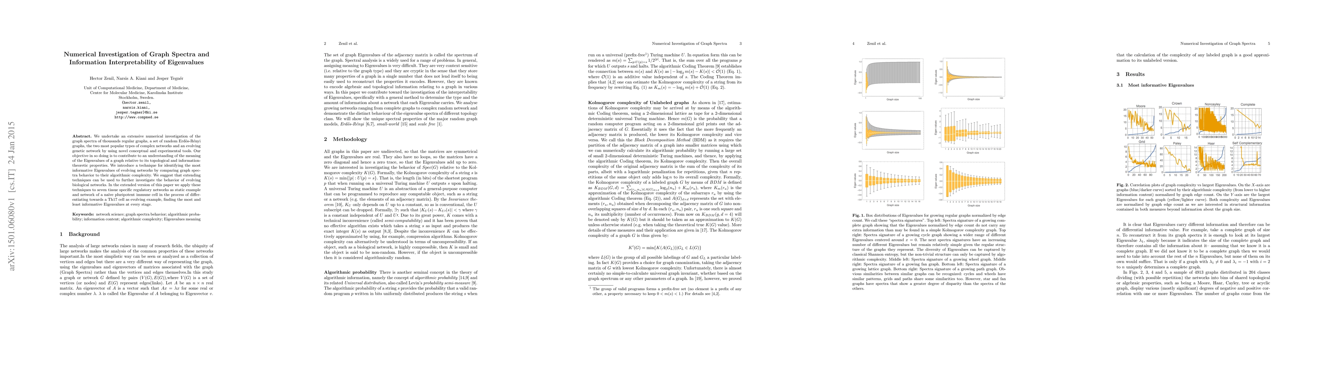 We undertake an extensive numerical investigation of the graph spectra of thousands regular graphs, a set of random Erd\"os-R\'enyi graphs, the two most popular types of complex networks and an evolving genetic network by using novel conceptual and experimental tools. Our objective in so doing is to contribute to an understanding of the meaning of the Eigenvalues of a graph relative to its topological and information-theoretic properties. We introduce a technique for identifying the most informative Eigenvalues of evolving networks by comparing graph spectra behavior to their algorithmic complexity. We suggest that extending techniques can be used to further investigate the behavior of evolving biological networks. In the extended version of this paper we apply these techniques to seven tissue specific regulatory networks as static example and network of a na\"ive pluripotent immune cell in the process of differentiating towards a Th17 cell as evolving example, finding the most and least informative Eigenvalues at every stage.