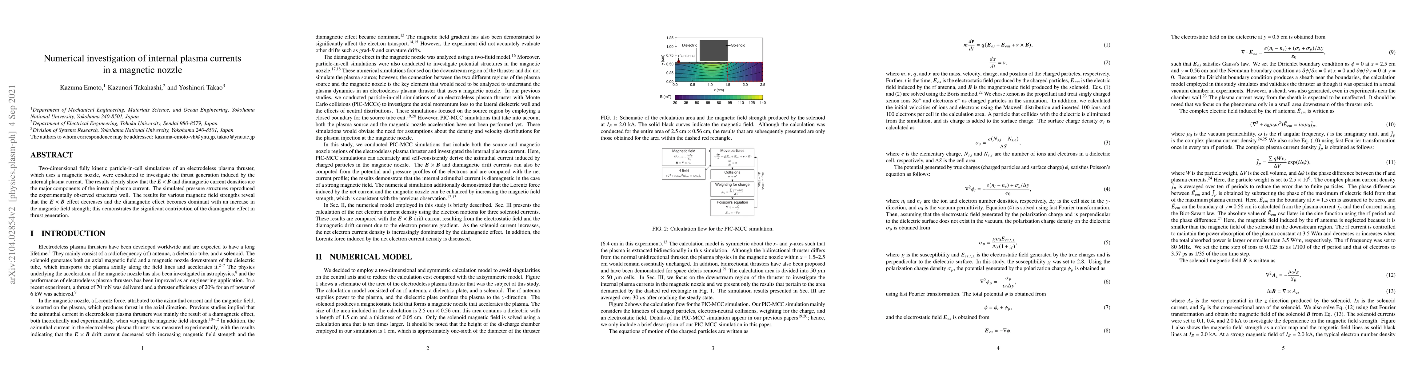 Two-dimensional fully kinetic particle-in-cell simulations of an electrodeless plasma thruster, which uses a magnetic nozzle, were conducted to investigate the thrust generation induced by the internal plasma current. The results clearly show that the $\bf{E} \times \bf{B}$ and diamagnetic current densities are the major components of the internal plasma current. The simulated pressure structures reproduced the experimentally observed structures well. The results for various magnetic field strengths reveal that the $\bf{E} \times \bf{B}$ effect decreases and the diamagnetic effect becomes dominant with an increase in the magnetic field strength; this demonstrates the significant contribution of the diamagnetic effect in thrust generation.