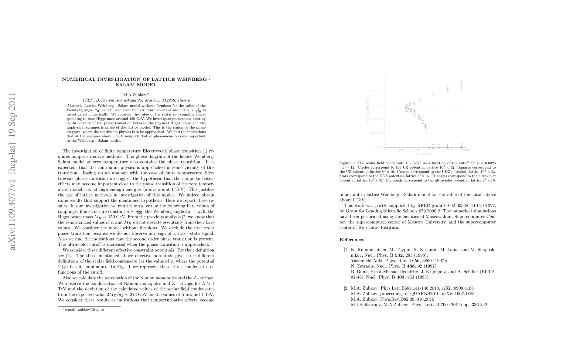 Lattice Weinberg - Salam model without fermions for the value of the Weinberg angle $\theta_W \sim 30^o$, and bare fine structure constant around $\alpha \sim 1/150$ is investigated numerically. We consider the value of the scalar self coupling corresponding to bare Higgs mass around 150 GeV. We investigate phenomena existing in the vicinity of the phase transition between the physical Higgs phase and the unphysical symmetric phase of the lattice model. This is the region of the phase diagram, where the continuum physics is to be approached. We find the indications that at the energies above 1 TeV nonperturbative phenomena become important in the Weinberg - Salam model.