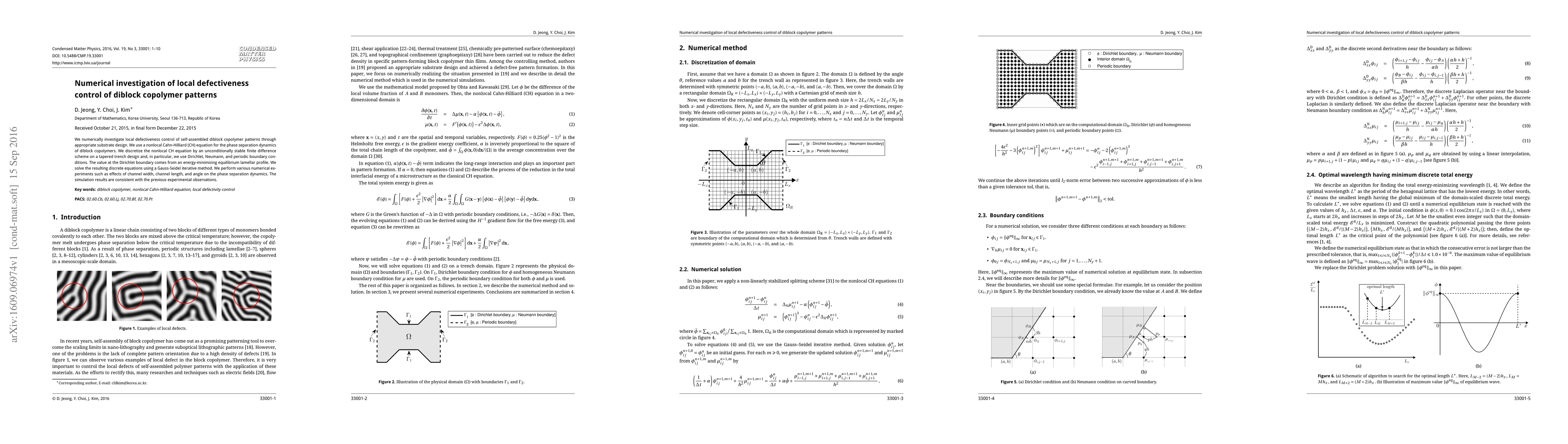 We numerically investigate local defectiveness control of self-assembled diblock copolymer patterns through appropriate substrate design. We use a nonlocal Cahn-Hilliard (CH) equation for the phase separation dynamics of diblock copolymers. We discretize the nonlocal CH equation by an unconditionally stable finite difference scheme on a tapered trench design and, in particular, we use Dirichlet, Neumann, and periodic boundary conditions. The value at the Dirichlet boundary comes from an energy-minimizing equilibrium lamellar profile. We solve the resulting discrete equations using a Gauss-Seidel iterative method. We perform various numerical experiments such as effects of channel width, channel length, and angle on the phase separation dynamics. The simulation results are consistent with the previous experimental observations.