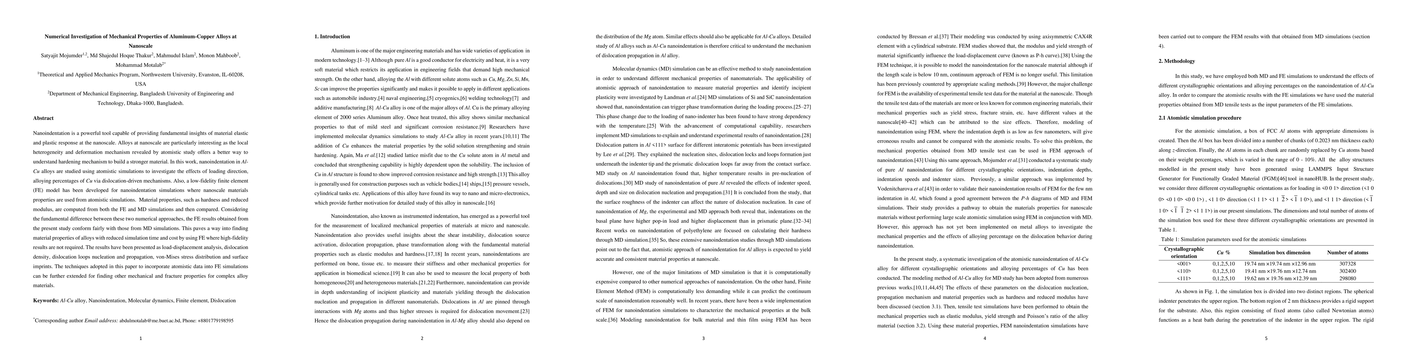 This paper investigates the mechanical properties of nanoscale aluminum-copper alloys using nanoindentation via atomistic simulations and low-fidelity finite element modeling. The study reveals insights into dislocation-driven mechanisms and validates FE models against atomistic data, offering a cost-effective method for material property analysis.