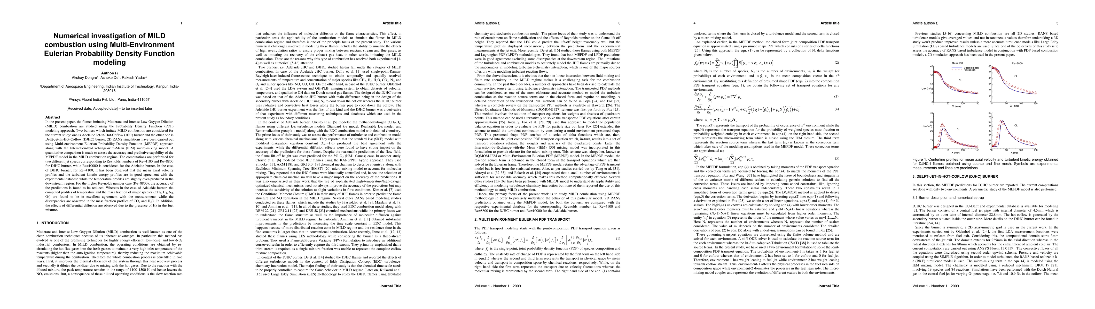 This paper investigates MILD combustion using MEPDF modeling and compares it with experimental data from two burners: Adelaide JHC and Delft DJHC. The MEPDF model shows good agreement with experimental profiles for the Adelaide burner but slightly over-predicts temperature downstream for the Delft burner at lower Reynolds numbers, with accuracy decreasing at higher Reynolds numbers.