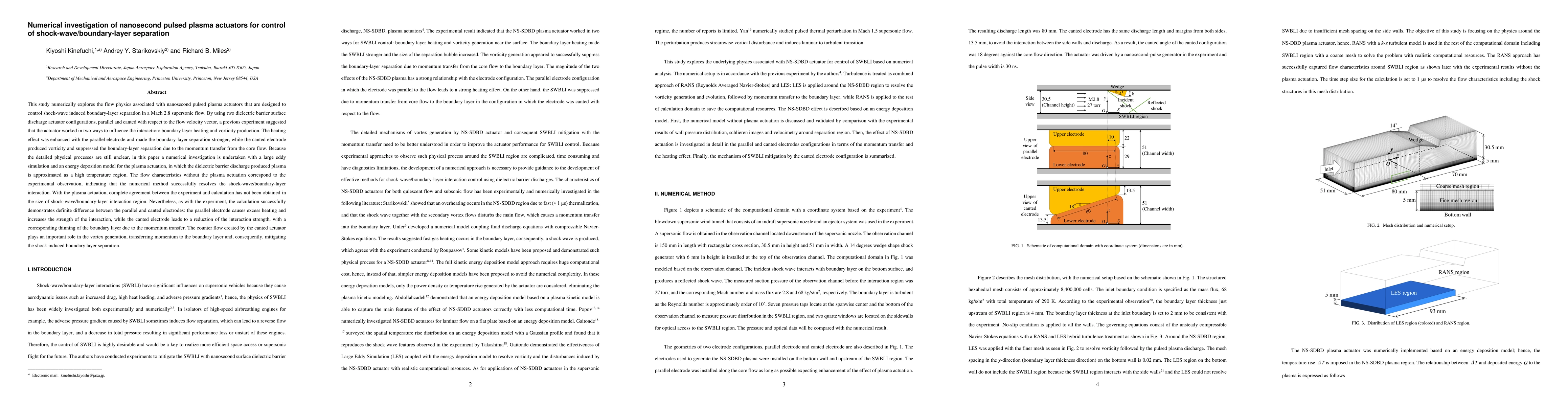 Researchers investigated the effectiveness of nanosecond pulsed plasma actuators in controlling shock-wave induced boundary-layer separation, finding that canted electrodes produce vorticity to suppress separation, while parallel electrodes cause excess heating and increase separation.