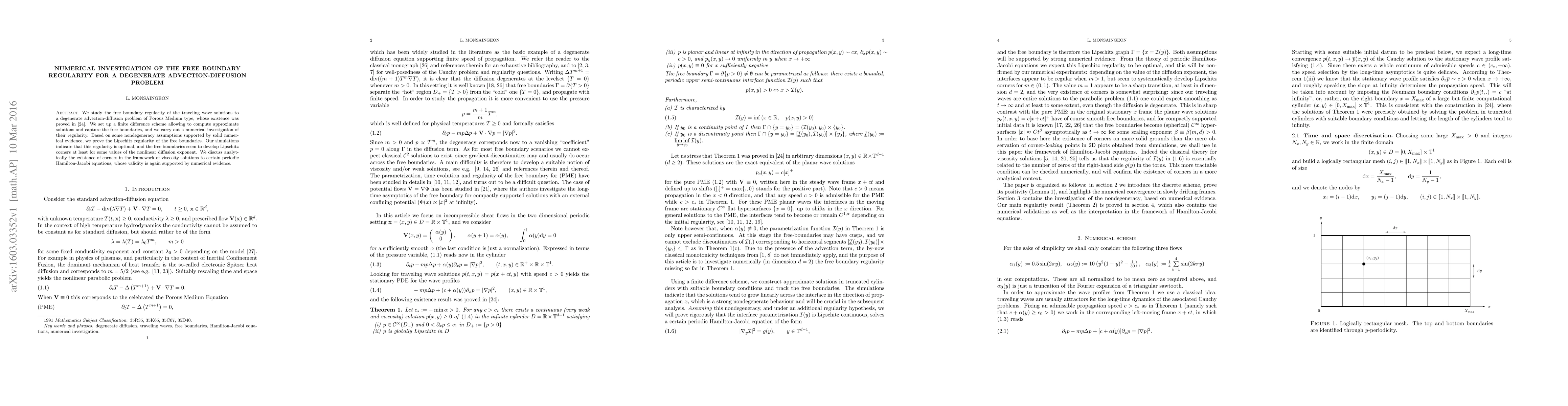 This research numerically investigates the free boundary regularity of traveling wave solutions in a degenerate advection-diffusion problem. Utilizing a finite difference scheme, the study proves Lipschitz regularity of the free boundaries with simulations suggesting this regularity is optimal. The findings indicate the presence of Lipschitz corners for certain diffusion exponents, supported by numerical evidence and analysis of periodic Hamilton-Jacobi equations.