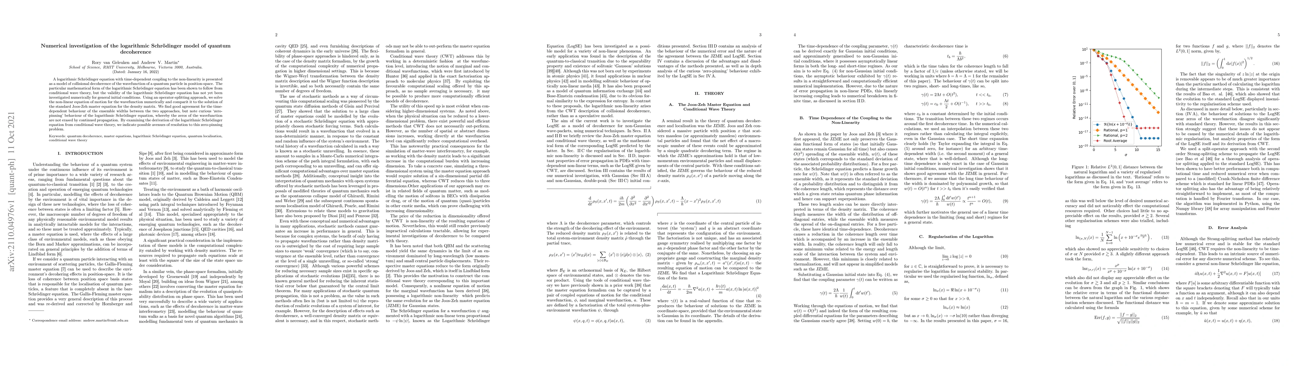 A logarithmic Schr\"odinger equation with time-dependent coupling to the non-linearity is presented as a model of collisional decoherence of the wavefunction of a quantum particle in position-space. The particular mathematical form of the logarithmic Schr\"odinger equation has been shown to follow from conditional wave theory, but the validity of the logarithmic Schr\"odinger equation has not yet been investigated numerically for general initial conditions. Using an operator-splitting approach, we solve the non-linear equation of motion for the wavefunction numerically and compare it it to the solution of the standard Joos-Zeh master equation for the density matrix. We find good agreement for the time-dependent behaviour of the ensemble widths between the two approaches, but note curious `zero-pinning' behaviour of the logarithmic Schr\"odinger equation, whereby the zeros of the wavefunction are not erased by continued propagation. By examining the derivation of the logarithmic Schr\"odinger equation from conditional wave theory, we indicate possible avenues of resolution to this zero-pinning problem.