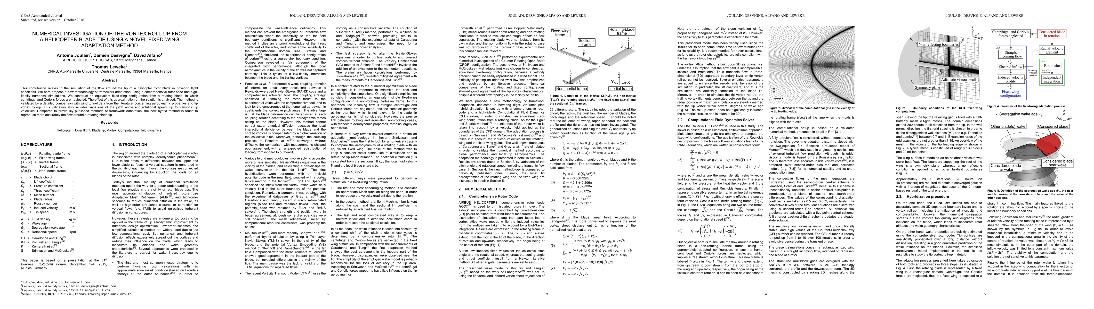 The paper presents a novel method for simulating helicopter rotor blade tip vortices by adapting a fixed-wing framework, neglecting centrifugal and Coriolis forces. The method's accuracy is validated against wind tunnel data, outperforming previous adaptation techniques in reproducing rotating blade tip flows under varying pitch angles and rotational speeds, including transonic conditions.