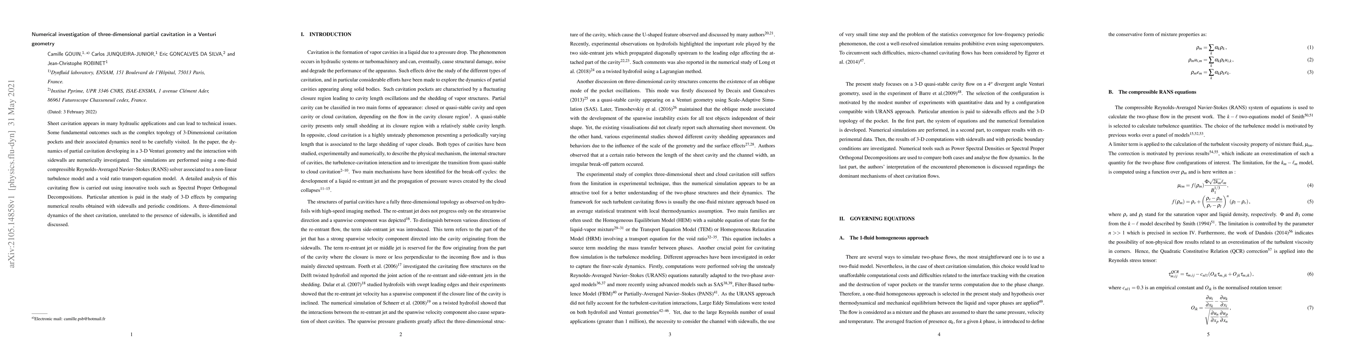 Sheet cavitation appears in many hydraulic applicationss and can lead to technical issues. Some fundamental outcomes such as the complex topology of 3-Dimensional cavitation pockets and their associated dynamics need to be carefully visited.In the present paper, the dynamics of partial cavitation developing in a 3-D Venturi geometry and the interaction with sidewalls are numerically investigated. The simulations are performed usinf a one-fluid compressible Reynolds-Averaged Navier-Stokes (RANS solver associated to a non-linear turbulence model and a void transport-equation model. A detailed analysis of this cavitating flow is carried out using innovative tools such as Spectral Proper Orthogonal Decompositions. Particular attenttion is paid in the study of 3-D effects by comparing numerical results obtained with sidewalls and periodic conditions. A three-dimensional dynamics of the sheet cavitation, unrelated to the presence of sidewalls, is identified and discussed.
