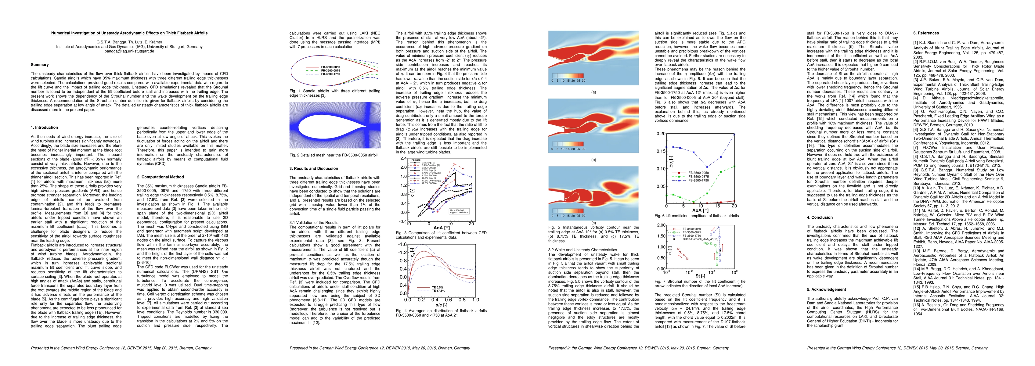 The unsteady characteristics of the flow over thick flatback airfoils have been investigated by means of CFD calculations. Sandia airfoils which have 35% maximum thickness with three different trailing edge thicknesses were selected. The calculations provided good results compared with available experimental data with regard to the lift curve and the impact of trailing edge thickness. Unsteady CFD simulations revealed that the Strouhal number is found to be independent of the lift coefficient before stall and increases with the trailing edge. The present work shows the dependency of the Strouhal number and the wake development on the trailing edge thickness. A recommendation of the Strouhal number definition is given for flatback airfoils by considering the trailing edge separation at low angle of attack. The detailed unsteady characteristics of thick flatback airfoils are discussed more in the present paper.