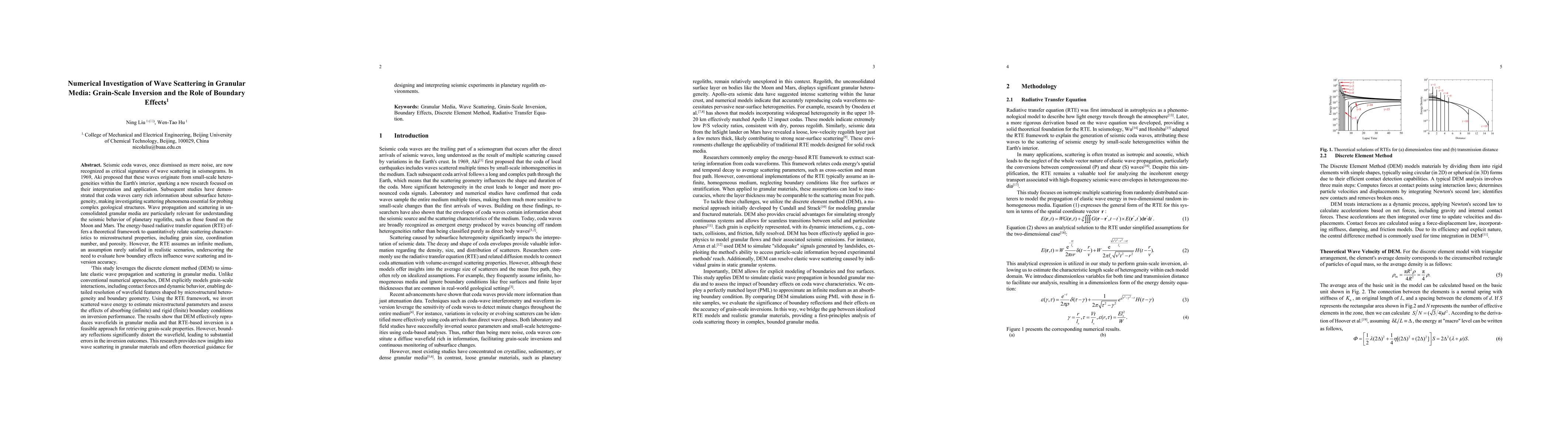 Seismic coda waves, once regarded as noise, are now recognized as key indicators of wave scattering in seismograms. Aki (1969) first proposed that these waves result from small-scale heterogeneities in the Earth's interior, spurring research into their interpretation and applications. Coda waves are now known to carry valuable information about subsurface heterogeneity, making the study of scattering essential for understanding complex geological structures. Wave scattering in unconsolidated granular media is especially relevant to planetary regoliths, such as those on the Moon and Mars. The radiative transfer equation (RTE) provides a theoretical framework to link scattering behavior to microstructural properties like grain size, coordination number, and porosity. However, the RTE assumes an infinite medium, a condition rarely met in real settings, emphasizing the need to evaluate how boundary effects influence scattering and inversion accuracy. This study uses the discrete element method (DEM) to simulate elastic wave propagation and scattering in granular media. Unlike traditional numerical methods, DEM explicitly models grain-scale interactions and dynamic behavior, capturing detailed wavefield features shaped by microstructural heterogeneity and boundary conditions. By applying the RTE framework, we invert scattered wave energy to estimate microstructural parameters and analyze the impact of absorbing (infinite) and rigid (finite) boundary conditions on inversion results. The findings show that DEM accurately reproduces wavefields in granular media and that RTE-based inversion can effectively recover grain-scale properties. However, boundary reflections significantly distort the wavefield and lead to notable errors in inversion outcomes.