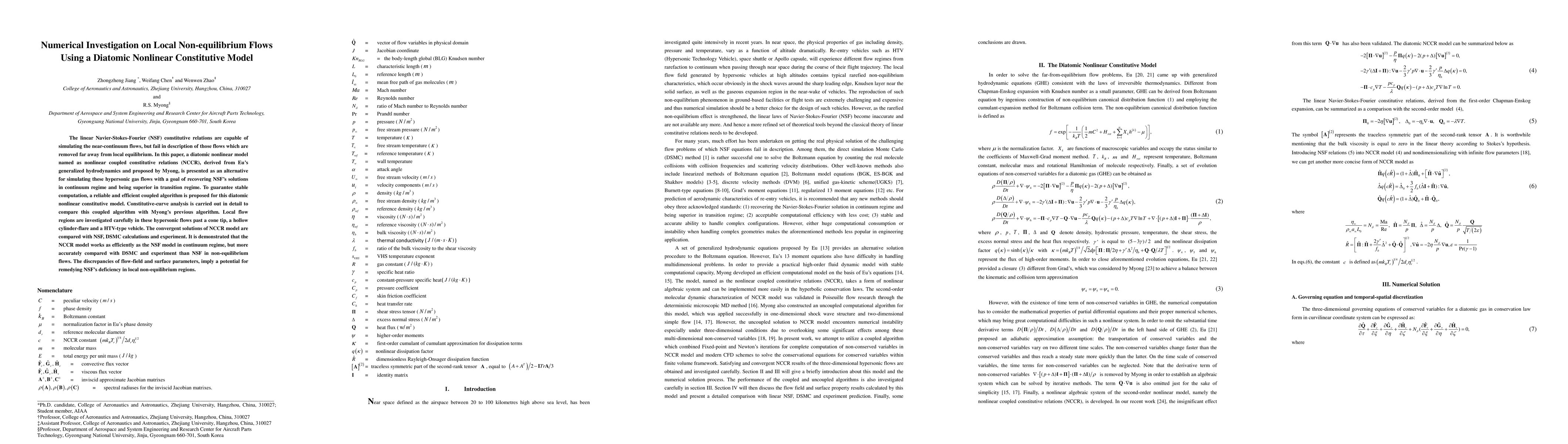 This paper introduces a diatomic nonlinear constitutive model, NCCR, to simulate hypersonic gas flows that deviate from local equilibrium, showing improved accuracy over the traditional NSF model in non-equilibrium regimes. The study validates the model's efficiency through computational analysis and comparisons with DSMC and experimental data.