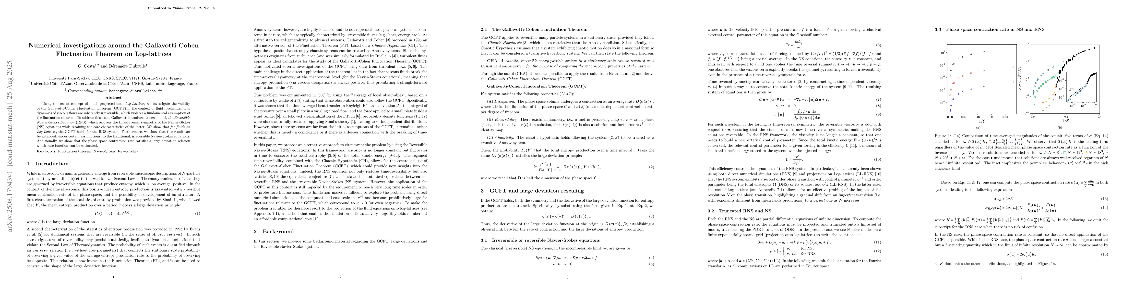 Using the recent concept of fluids projected onto Log-Lattices, we investigate the validity of the Gallavotti-Cohen Fluctuation Theorem (GCFT) in the context of fluid mechanics. The dynamics of viscous flows are inherently irreversible, which violates a fundamental assumption of the fluctuation theorem. To address this issue, Gallavotti introduced a new model, the Reversible Navier-Stokes Equation (RNS), which recovers the time-reversal symmetry of the Navier-Stokes (NS) equations while retaining the core characteristics of the latter. We show that for fluids on Log-Lattices, the GCFT holds for the RNS system. Furthermore, we show that this result can be extended, under certain assumptions, to the traditional, irreversible Navier-Stokes equations. Additionally, we show that the phase space contraction rate satisfies a large deviation relation which rate function can be estimated.