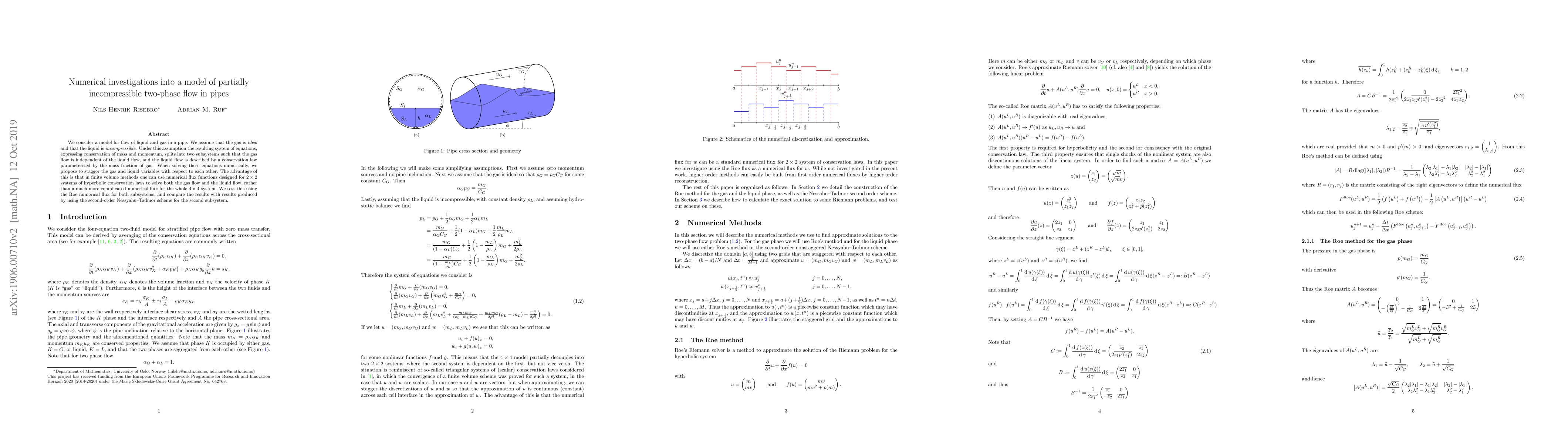 Researchers investigate a numerical model for two-phase flow in pipes, assuming the gas is ideal and the liquid is incompressible. They propose staggering variables to simplify calculations and compare results with different numerical flux functions.