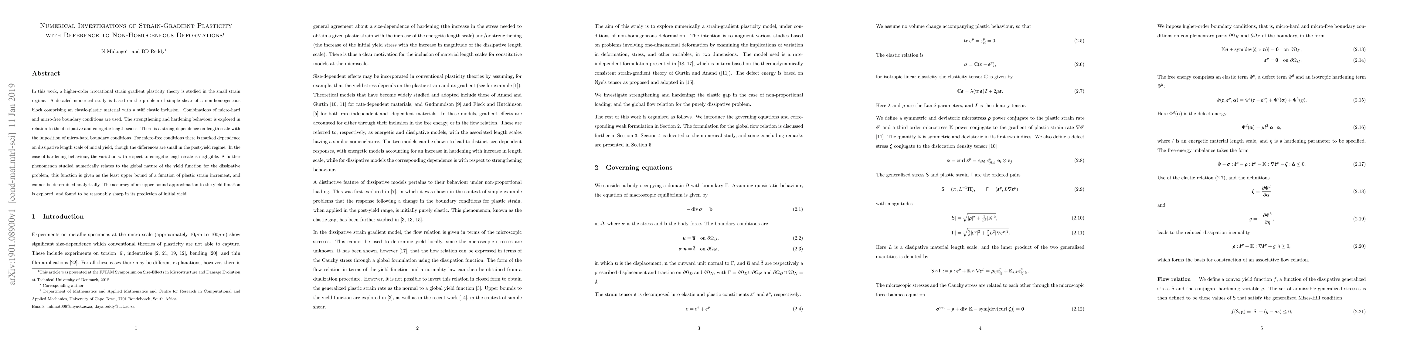 In this work, a higher-order irrotational strain gradient plasticity theory is studied in the small strain regime. A detailed numerical study is based on the problem of simple shear of a non-homogeneous block comprising an elastic-plastic material with a stiff? elastic inclusion. Combinations of micro-hard and micro-free boundary conditions are used. The strengthening and hardening behavior is explored in relation to the dissipative and energetic length scales. There is a strong dependence on length scale with the imposition of micro-hard boundary conditions. For micro-free conditions there is marked dependence on dissipative length scale of initial yield, though the differences are small in the post-yield regime. In the case of hardening behavior, the variation with respect to energetic length scale is negligible. A further phenomenon studied numerically relates to the global nature of the yield function for the dissipative problem; this function is given as the least upper bound of a function of plastic strain increment, and cannot be determined analytically. The accuracy of an upper-bound approximation to the yield function is explored, and found to be reasonably sharp in its prediction of initial yield.