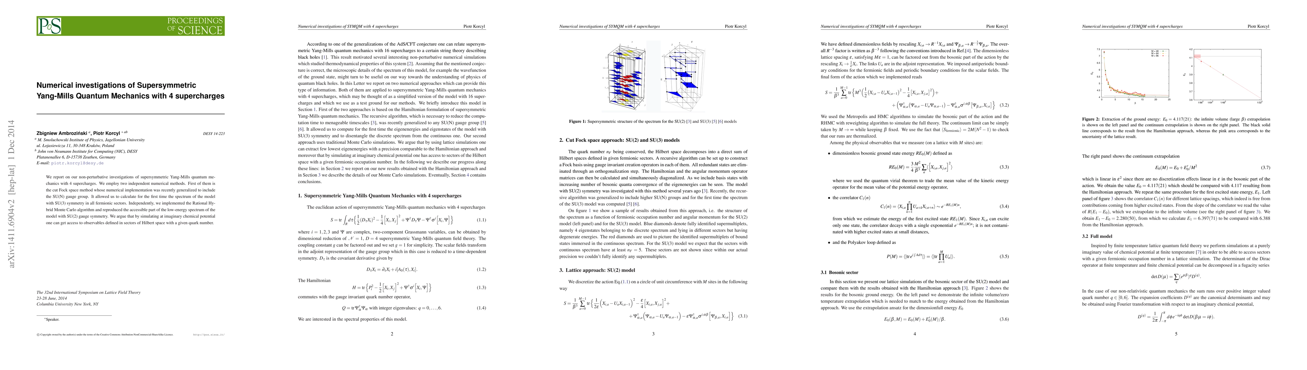 We report on our non-perturbative investigations of supersymmetric Yang-Mills quantum mechanics with 4 supercharges. We employ two independent numerical methods. First of them is the cut Fock space method whose numerical implementation was recently generalized to include the SU(N) gauge group. It allowed us to calculate for the first time the spectrum of the model with SU(3) symmetry in all fermionic sectors. Independently, we implemented the Rational Hybrid Monte Carlo algorithm and reproduced the accessible part of the low-energy spectrum of the model with SU(2) gauge symmetry. We argue that by simulating at imaginary chemical potential one can get access to observables defined in sectors of Hilbert space with a given quark number.