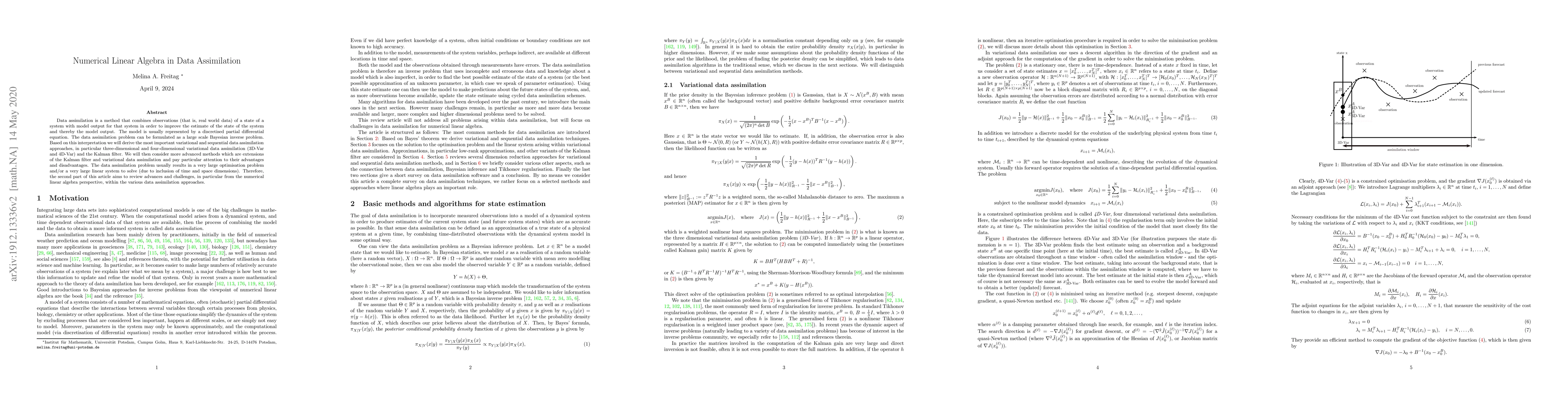 This paper explores variational and sequential data assimilation methods, focusing on 3D-Var, 4D-Var, and the Kalman filter, alongside advanced extensions. It highlights numerical linear algebra challenges in solving large-scale optimization problems and linear systems inherent in data assimilation.