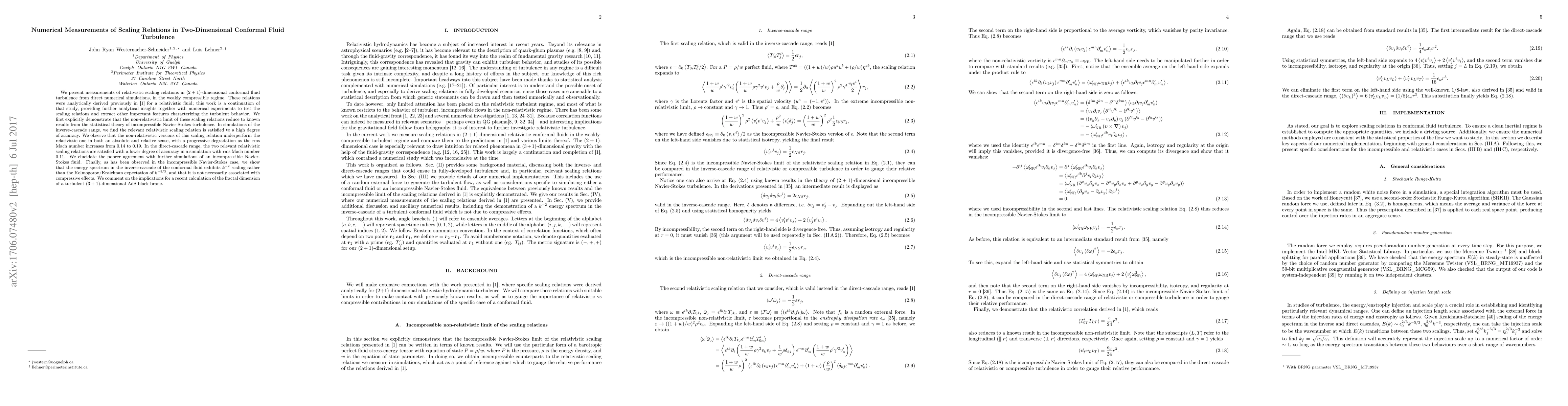 We present measurements of relativistic scaling relations in $(2+1)$-dimensional conformal fluid turbulence from direct numerical simulations, in the weakly compressible regime. These relations were analytically derived previously in Westernacher-Schneider, Lehner, Oz (2015) for a relativistic fluid; this work is a continuation of that study, providing further analytical insights together with numerical experiments to test the scaling relations and extract other important features characterizing the turbulent behavior. We first explicitly demonstrate that the non-relativistic limit of these scaling relations reduce to known results from the statistical theory of incompressible Navier-Stokes turbulence. In simulations of the inverse-cascade range, we find the relevant relativistic scaling relation is satisfied to a high degree of accuracy. We observe that the non-relativistic versions of this scaling relation underperform the relativistic one in both an absolute and relative sense, with a progressive degradation as the rms Mach number increases from $0.14$ to $0.19$. In the direct-cascade range, the two relevant relativistic scaling relations are satisfied with a lower degree of accuracy in a simulation with rms Mach number $0.11$. We elucidate the poorer agreement with further simulations of an incompressible Navier-Stokes fluid. Finally, as has been observed in the incompressible Navier-Stokes case, we show that the energy spectrum in the inverse-cascade of the conformal fluid exhibits $k^{-2}$ scaling rather than the Kolmogorov/Kraichnan expectation of $k^{-5/3}$, and that it is not necessarily associated with compressive effects. We comment on the implications for a recent calculation of the fractal dimension of a turbulent $(3+1)$-dimensional AdS black brane.