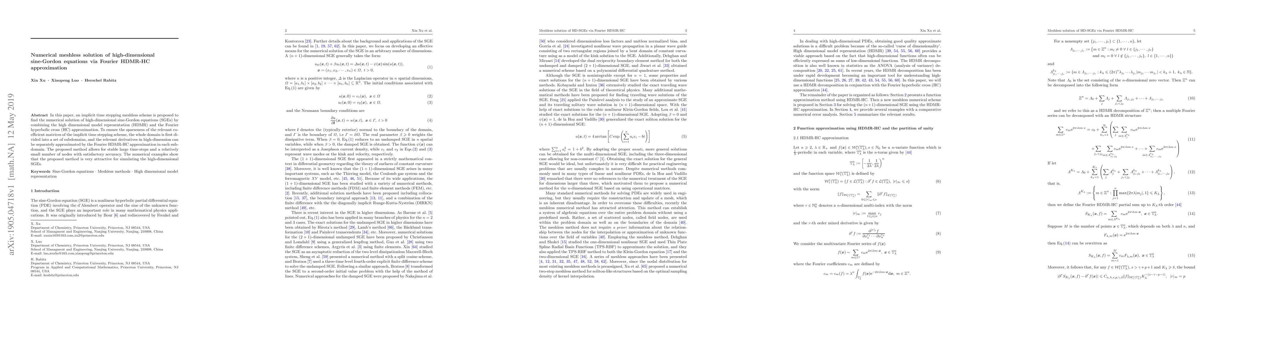 This paper proposes an implicit time stepping meshless scheme for solving high-dimensional sine-Gordon equations using a combination of high-dimensional model representation and Fourier hyperbolic cross approximation. The method divides the domain into subdomains for efficient computation, enabling stable large time-steps and accurate results with fewer nodes.