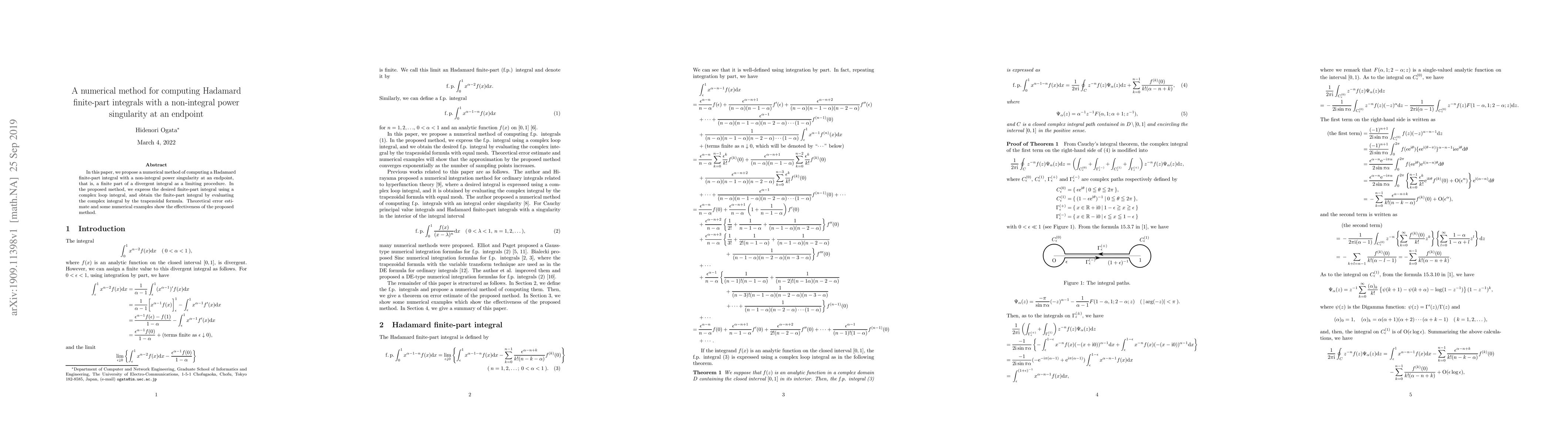 In this paper, we propose a numerical method of computing a Hadamard finite-part integral with a non-integral power singularity at an endpoint, that is, a finite part of a divergent integral as a limiting procedure. In the proposed method, we express the desired finite-part integral using a complex loop integral, and obtain the finite-part integral by evaluating the complex integral by the trapezoidal formula. Theoretical error estimate and some numerical examples show the effectiveness of the proposed method.
