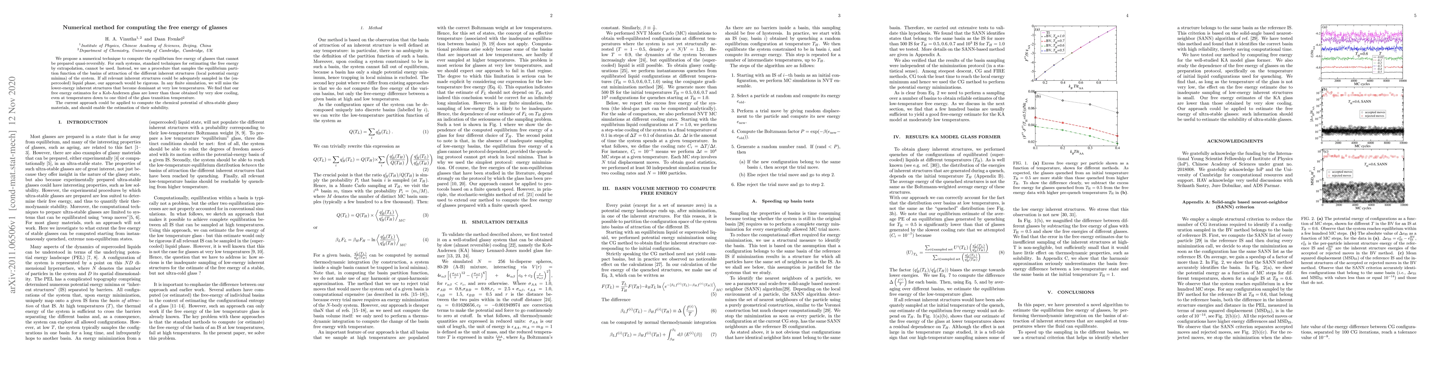 We propose a numerical technique to compute the equilibrium free energy of glasses that cannot be prepared quasi-reversibly. For such systems, standard techniques for estimating the free energy by extrapolation, cannot be used. Instead, we use a procedure that samples the equilibrium partition function of the basins of attraction of the different inherent structures (local potential energy minima) of the system. If all relevant inherent structures could be adequately sampled in the (supercooled) liquid phase, our approach would be rigorous. In any finite simulation, we will miss the lower-energy inherent structures that become dominant at very low temperatures. We find that our free energy estimates for a Kob-Andersen glass are lower than those obtained by very slow cooling, even at temperatures down to one third of the glass transition temperature. The current approach could be applied to compute the chemical potential of ultra-stable glassy materials, and should enable the estimation of their solubility.