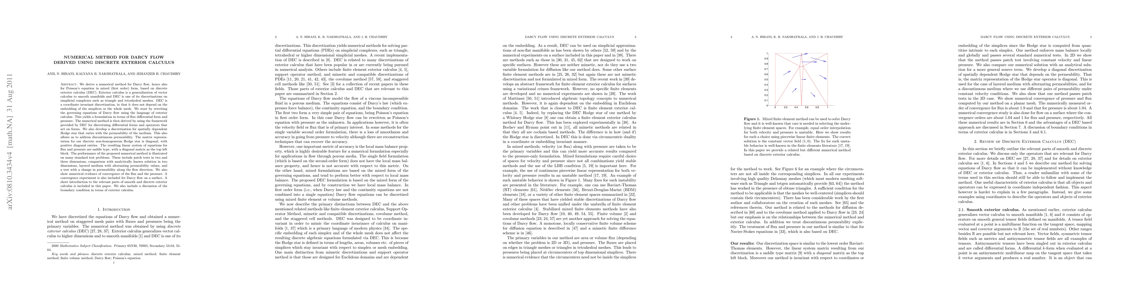 This paper proposes a numerical method for Darcy flow utilizing Discrete Exterior Calculus (DEC). It rewrites Darcy flow equations in the language of exterior calculus and derives a method that discretizes differential forms and operators. The resulting linear system is saddle-type with a diagonal matrix, facilitating efficient computation. The method is validated through various test problems and demonstrates convergence.