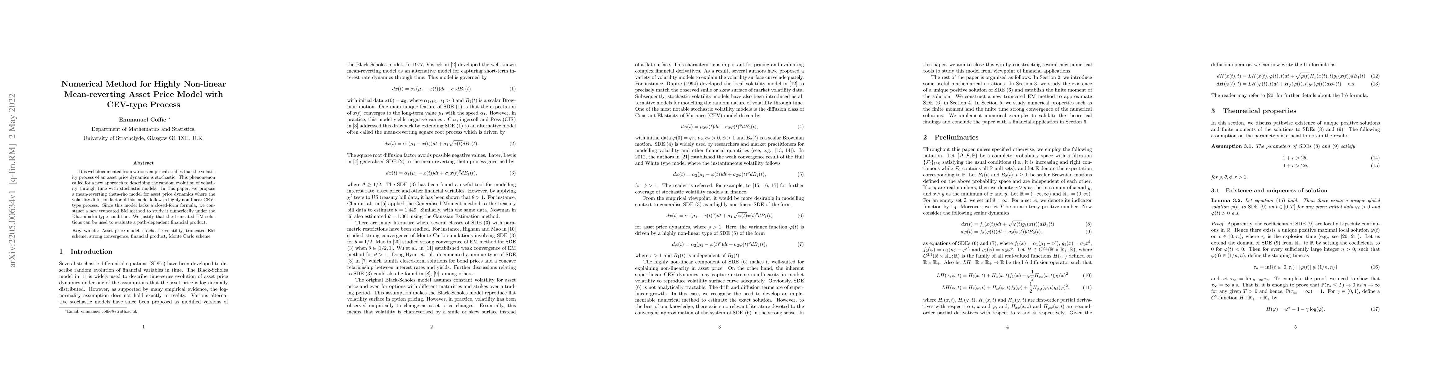 It is well documented from various empirical studies that the volatility process of an asset price dynamics is stochastic. This phenomenon called for a new approach to describing the random evolution of volatility through time with stochastic models. In this paper, we propose a mean-reverting theta-rho model for asset price dynamics where the volatility diffusion factor of this model follows a highly non-linear CEV-type process. Since this model lacks a closed-form formula, we construct a new truncated EM method to study it numerically under the Khasminskii-type condition. We justify that the truncated EM solutions can be used to evaluate a path-dependent financial product.