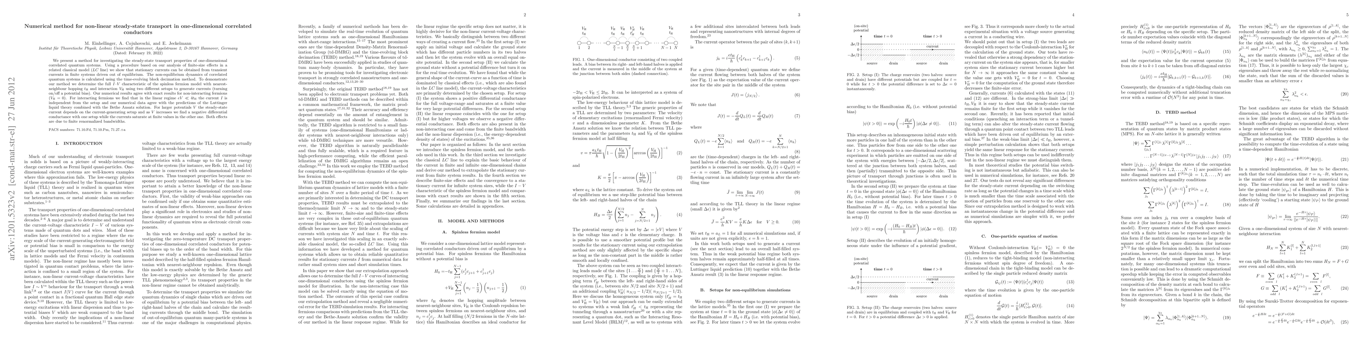 We present a method for investigating the steady-state transport properties of one-dimensional correlated quantum systems. Using a procedure based on our analysis of finite-size effects in a related classical model (LC line) we show that stationary currents can be obtained from transient currents in finite systems driven out of equilibrium. The non-equilibrium dynamics of correlated quantum systems is calculated using the time-evolving block decimation method. To demonstrate our method we determine the full I-V characteristic of the spinless fermion model with nearest-neighbour hopping t_H and interaction V_H using two different setups to generate currents (turning on/off a potential bias). Our numerical results agree with exact results for non-interacting fermions (V_H=0). For interacting fermions we find that in the linear regime eV << 4t_H the current I is independent from the setup and our numerical data agree with the predictions of the Luttinger liquid theory combined with the Bethe Ansatz solution. For larger potentials V the steady-state current depends on the current-generating setup and as V increases we find a negative differential conductance with one setup while the currents saturate at finite values in the other one. Both effects are due to finite renormalized bandwidths.