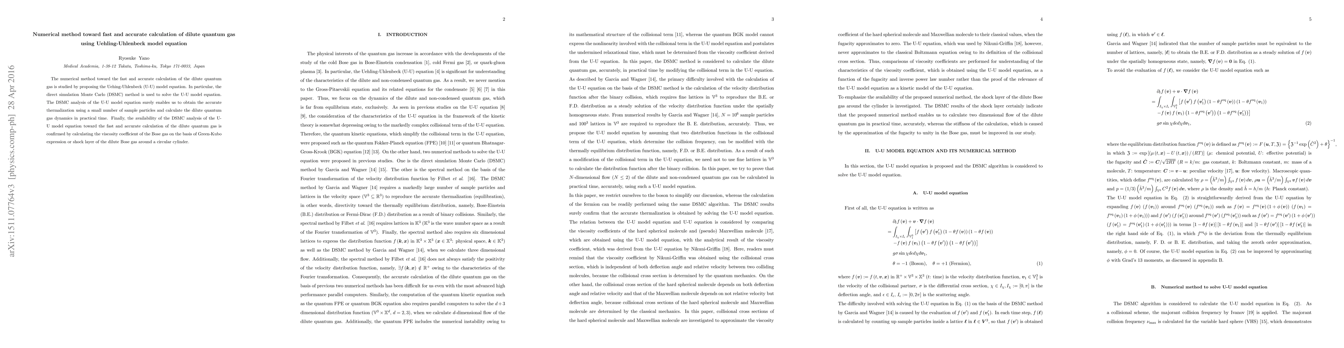 The numerical method toward the fast and accurate calculation of the dilute quantum gas is studied by proposing the Uehing-Uhlenbeck (U-U) model equation. In particular, the direct simulation Monte Carlo (DSMC) method is used to solve the U-U model equation. The DSMC analysis of the U-U model equation surely enables us to obtain the accurate thermalization using a small number of sample particles and calculate the dilute quantum gas dynamics in practical time. Finally, the availability of the DSMC analysis of the U-U model equation toward the fast and accurate calculation of the dilute quantum gas is confirmed by calculating the viscosity coefficient of the Bose gas on the basis of Green-Kubo expression or shock layer of the dilute Bose gas around a circular cylinder