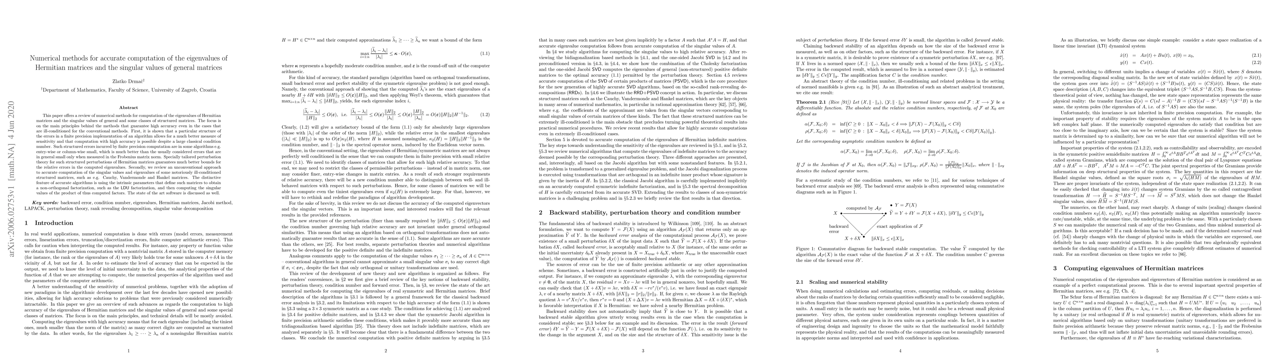 This paper reviews numerical methods for accurately computing eigenvalues of Hermitian matrices and singular values of general matrices, emphasizing high-accuracy techniques for ill-conditioned cases. It highlights structured error analysis and perturbation theory to achieve better bounds on relative errors, and discusses unconventional approaches for structured matrices like Cauchy and Vandermonde.