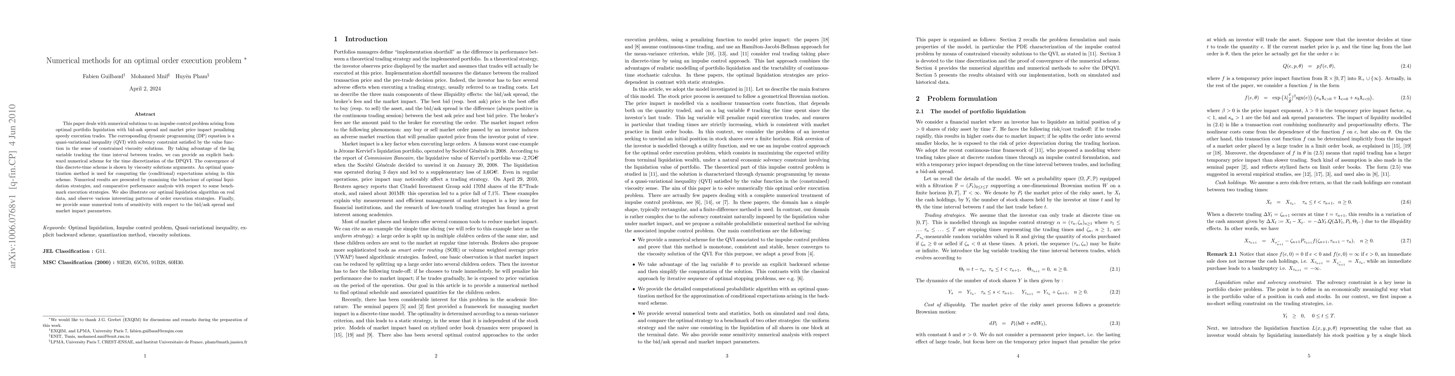 This paper deals with numerical solutions to an impulse control problem arising from optimal portfolio liquidation with bid-ask spread and market price impact penalizing speedy execution trades. The corresponding dynamic programming (DP) equation is a quasi-variational inequality (QVI) with solvency constraint satisfied by the value function in the sense of constrained viscosity solutions. By taking advantage of the lag variable tracking the time interval between trades, we can provide an explicit backward numerical scheme for the time discretization of the DPQVI. The convergence of this discrete-time scheme is shown by viscosity solutions arguments. An optimal quantization method is used for computing the (conditional) expectations arising in this scheme. Numerical results are presented by examining the behaviour of optimal liquidation strategies, and comparative performance analysis with respect to some benchmark execution strategies. We also illustrate our optimal liquidation algorithm on real data, and observe various interesting patterns of order execution strategies. Finally, we provide some numerical tests of sensitivity with respect to the bid/ask spread and market impact parameters.
