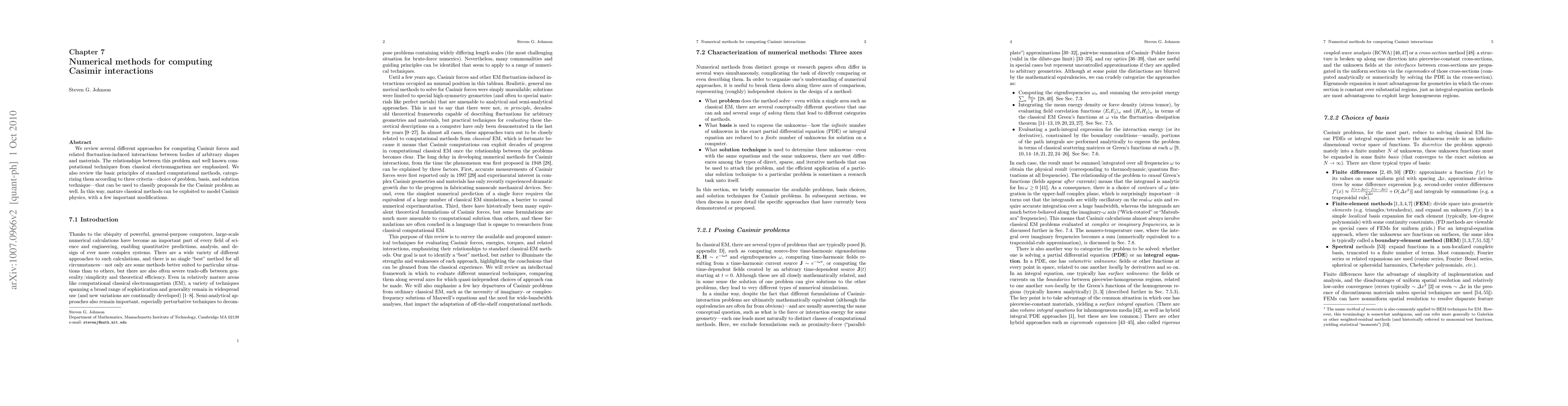 Researchers review numerical methods for computing Casimir interactions between bodies of arbitrary shapes and materials, leveraging classical electromagnetism techniques with modifications to model this phenomenon.
