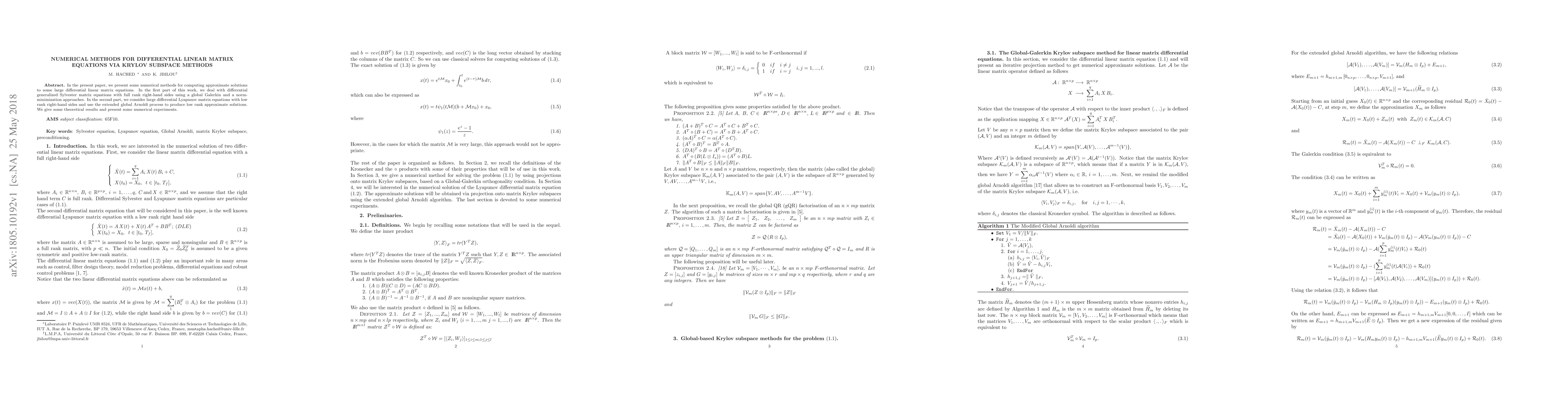 This paper proposes numerical methods for solving large differential linear matrix equations using Krylov subspace techniques. It focuses on differential generalized Sylvester and Lyapunov matrix equations, employing global Galerkin, norm-minimization, and extended global Arnoldi processes to obtain approximate solutions.