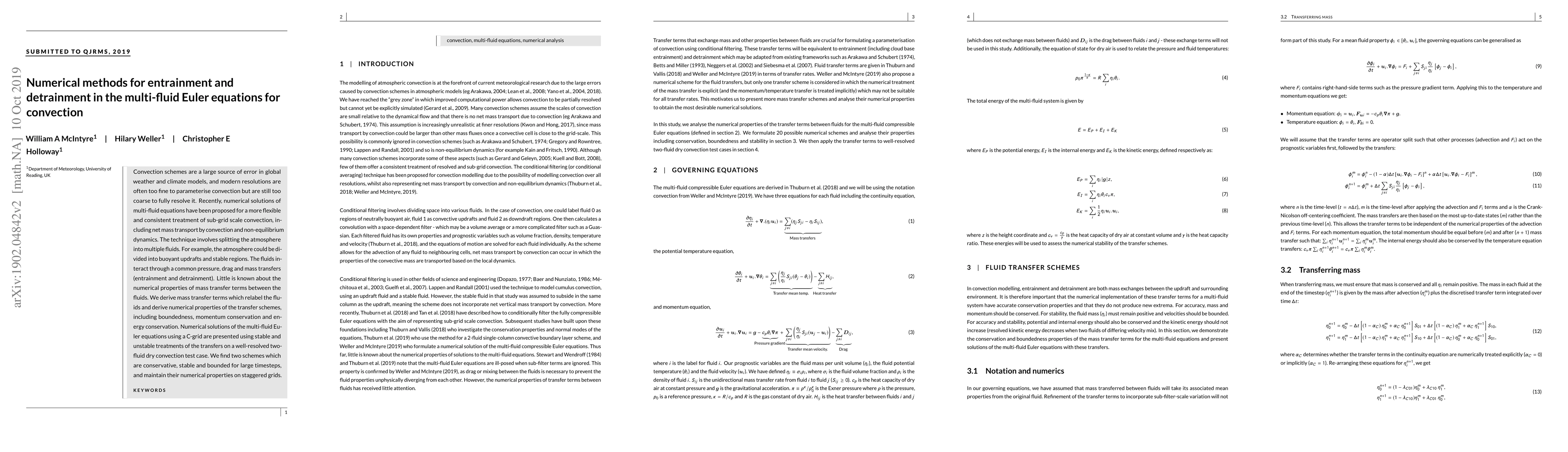 This paper develops numerical methods for entrainment and detrainment in multi-fluid Euler equations to better model convection in weather and climate models. It presents two conservative, stable, and bounded schemes for mass transfer between fluids, validated on a dry convection test case.